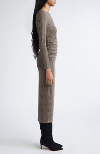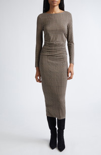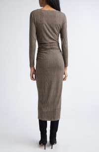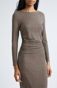 A classic glen plaid plays up the workday appeal of this long-sleeve midi dress framed by elegant side ruching. Jewel neck Long sleeves 90% lyocell, 10% elastane Dry clean Imported