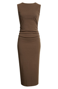 A sleeveless, columnar dress is crafted from stretch-kissed cotton with dimensional ruching at the sides and is easy to style up or down depending on how you accessorize it. Bateau neck Sleeveless 92% cotton, 8% elastane Dry clean or machine wash, tumble dry Imported