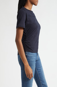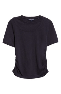 Slubbed cotton adds subtle depth and dimension to the airy jersey knit of this T-shirt that switches up the classic styling with a layered-look neckline and shapely ruched sides. Crewneck Short sleeves 100% cotton Machine wash, dry flat Imported