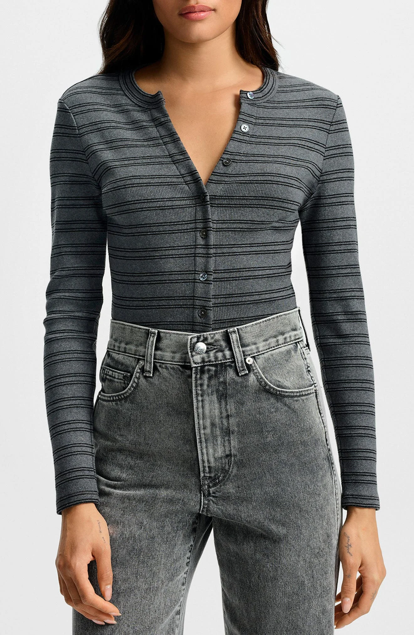Twinned stripes pattern a stretch-kissed cotton top that adds just a simmer of shimmer to elevate the everyday staple. Front button closure Crewneck Long sleeves 90% cotton, 4% metallic fibers, 4% polyamide, 2% elastane Machine wash, dry flat Imported