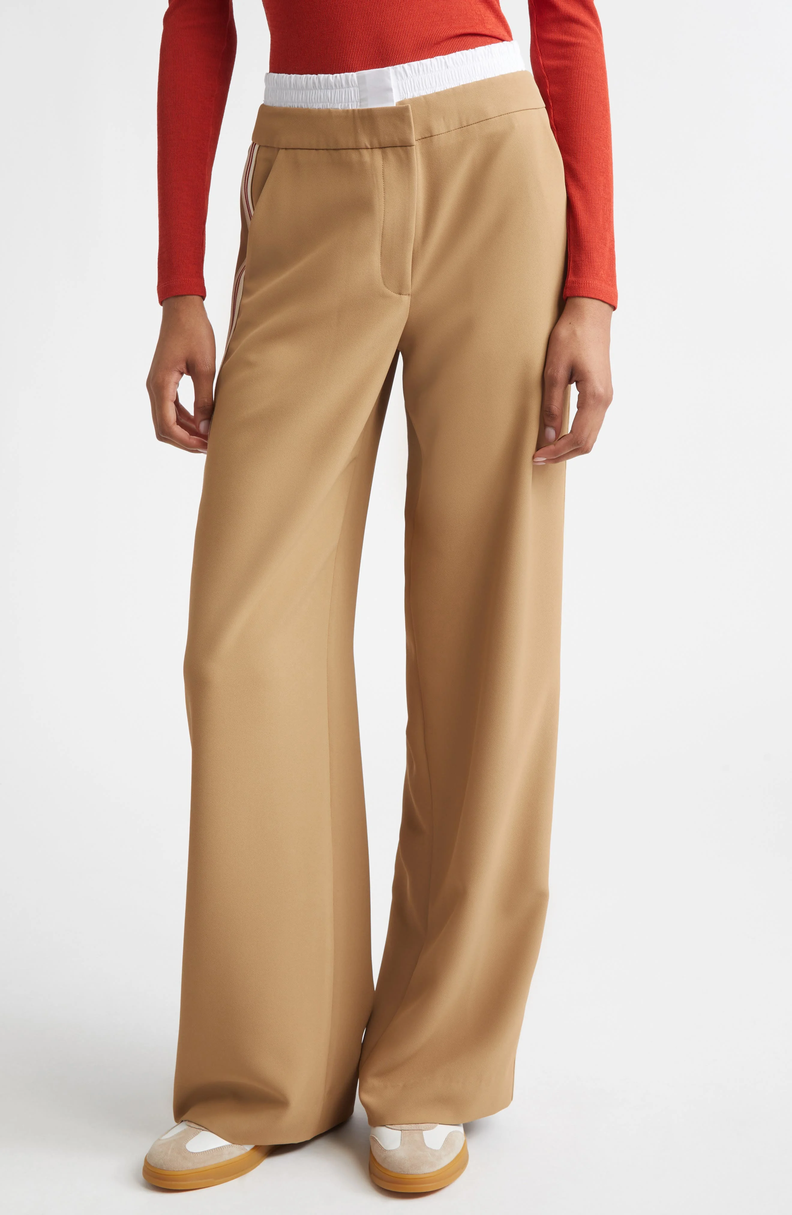 A playful 'exposed-boxers' waist tops wide-leg gabardine trousers finished with a tape detail of sporty stripes. Zip fly with hook-and-bar closure Front slant pockets; back welt pockets 97% polyester, 3% elastane Dry clean Imported