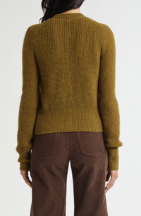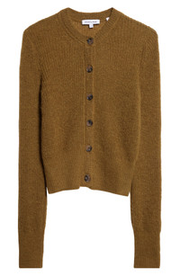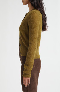 Made to gently hug your body, this fuzzy-textured cardigan is trimmed with wide ribbing at the hem and cuffs. Tortoise buttons put the finishing touches on this soft yet sophisticated look. Front button closure Crewneck Long sleeves 35% mohair, 35% alpaca, 30% polyamide Dry clean Imported