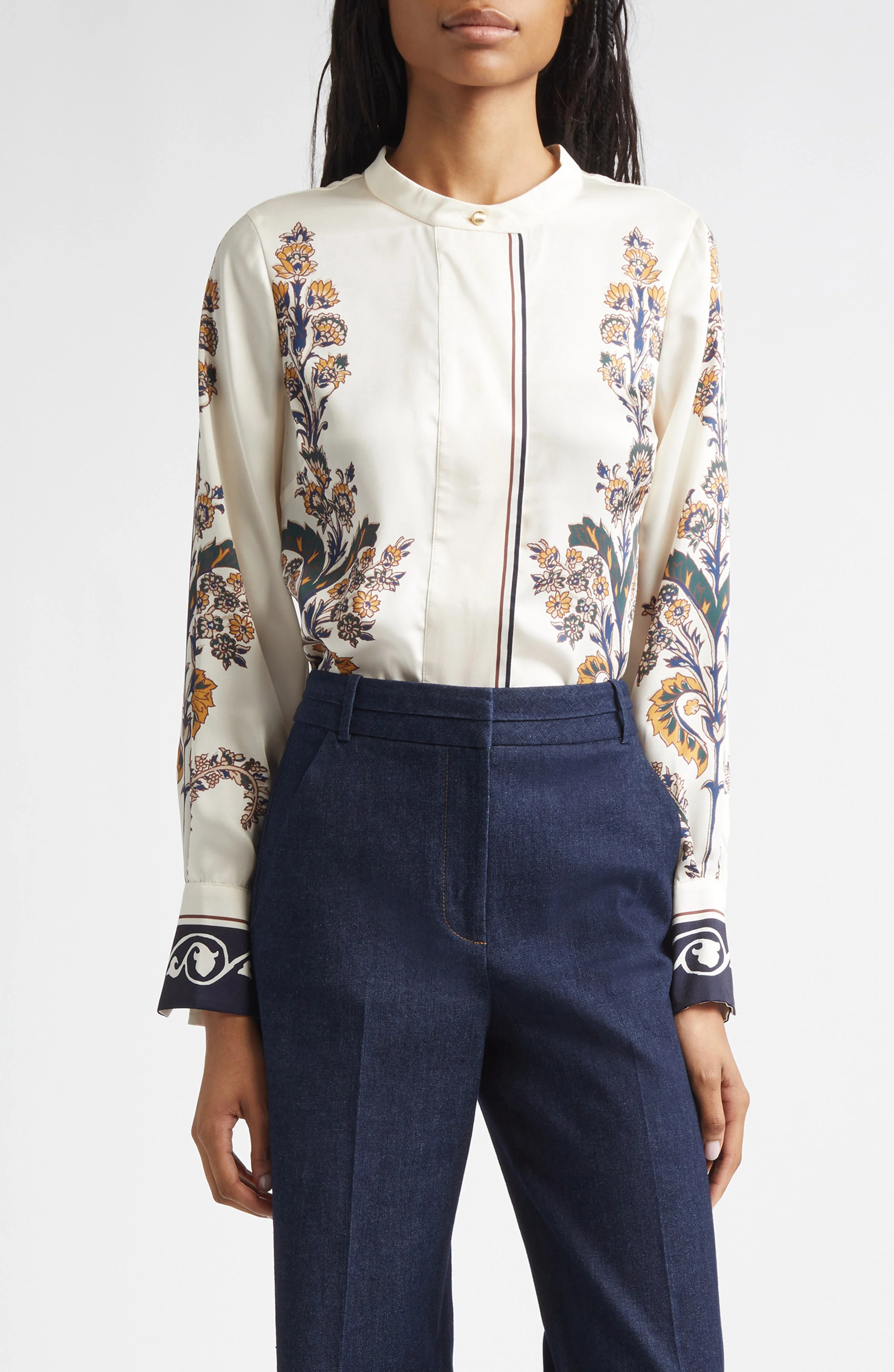 Sharp tailoring meets artful detail in this sophisticated top. A refined floral pattern frames the sleeves and sides, while crisp stripes trace the hidden placket. Finished with a stand collar and balloon sleeves, it brings polished structure with a modern, expressive edge. Front button closure Stand collar Long sleeves 100% polyester Dry clean Imported