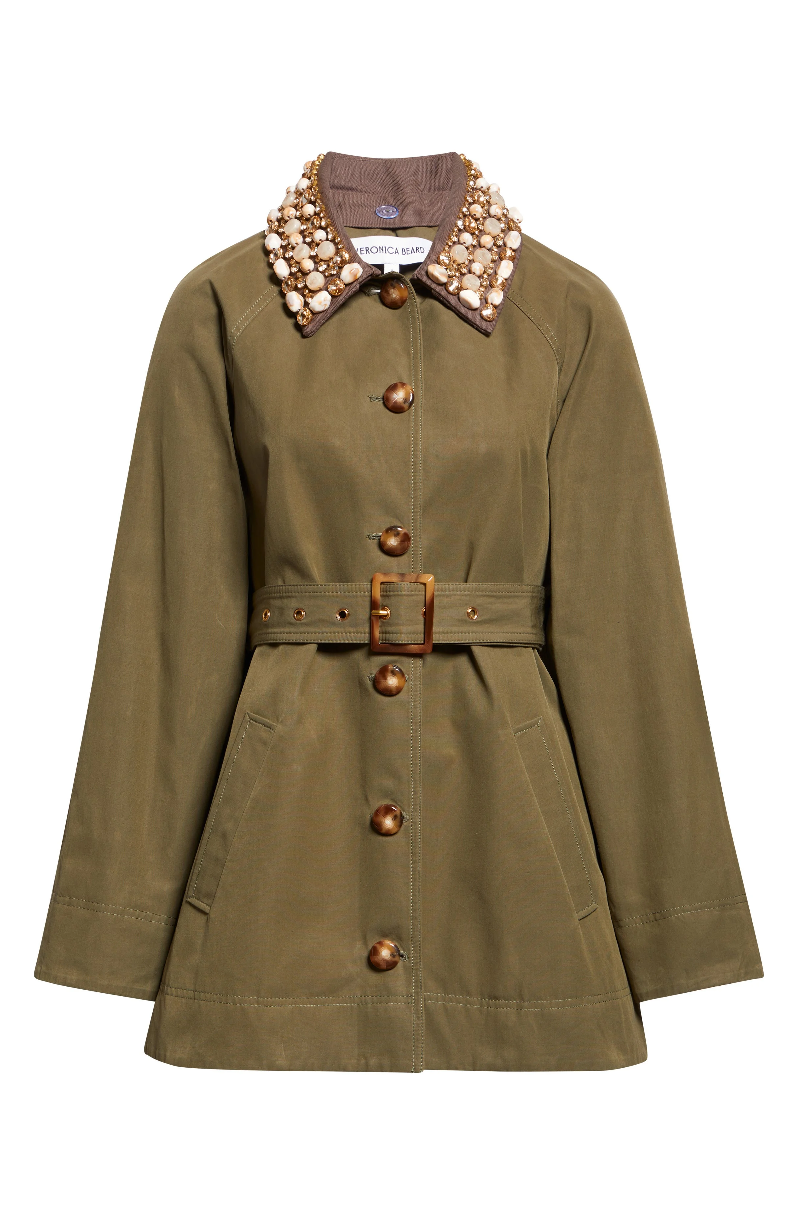 Glossy stones and sparkling crystals adorn the removable collar of this waxed-finish coat cinched with a wide belt centered by a faux-horn buckle. Front button closure Spread collar Fold-back cuffs Front welt pockets Removable belt Compatible with all Veronica Beard dickeys (sold separately) Water resistant Cupro lining 46% cotton, 38% polyester, 16% polyamide Dry clean Imported