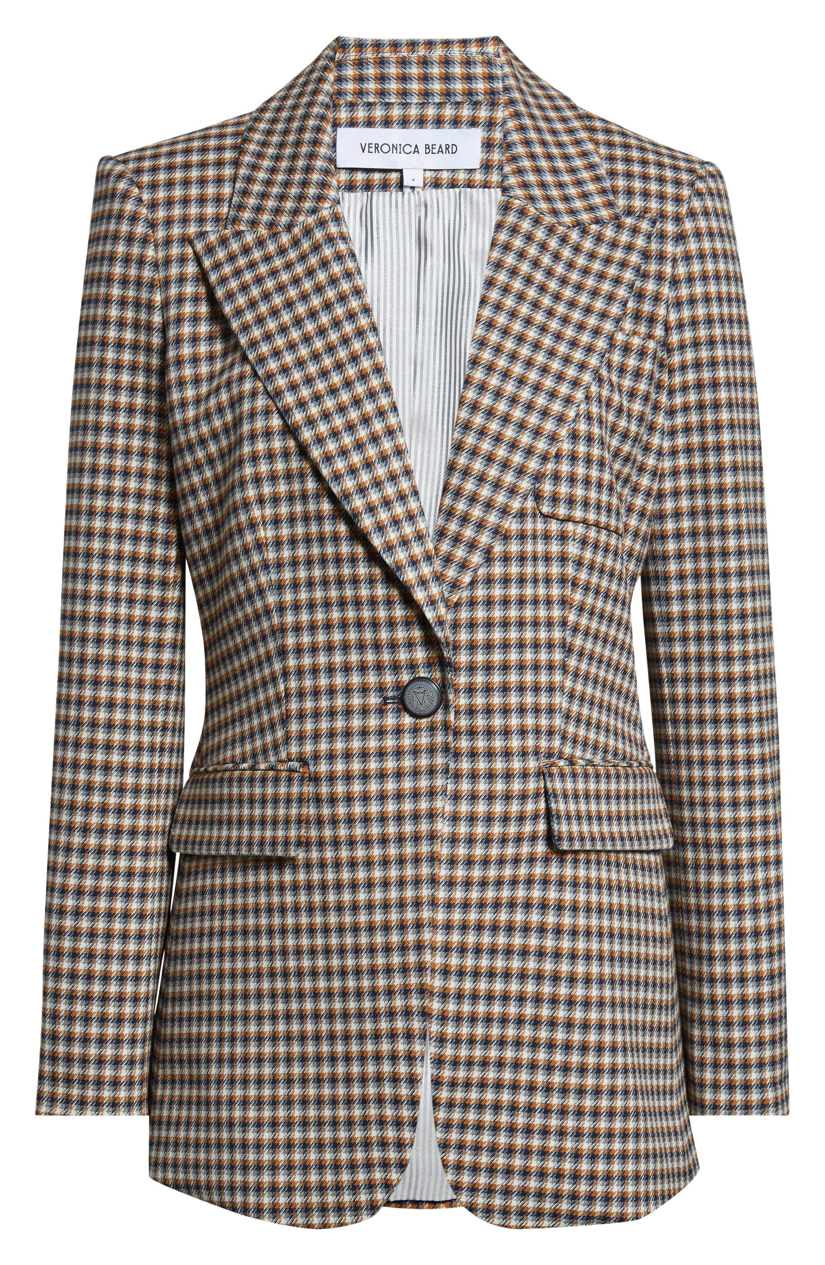 The label's signature silhouette comes through checked in autumnal hues, secured by a single crested button and cut from stretch-eased twill. One-button closure Peaked lapels Chest patch pocket; front flap pockets Compatible with all Veronica Beard dickeys (sold separately) Lined 64% polyester, 34% viscose, 2% elastane Dry clean Made in the USA