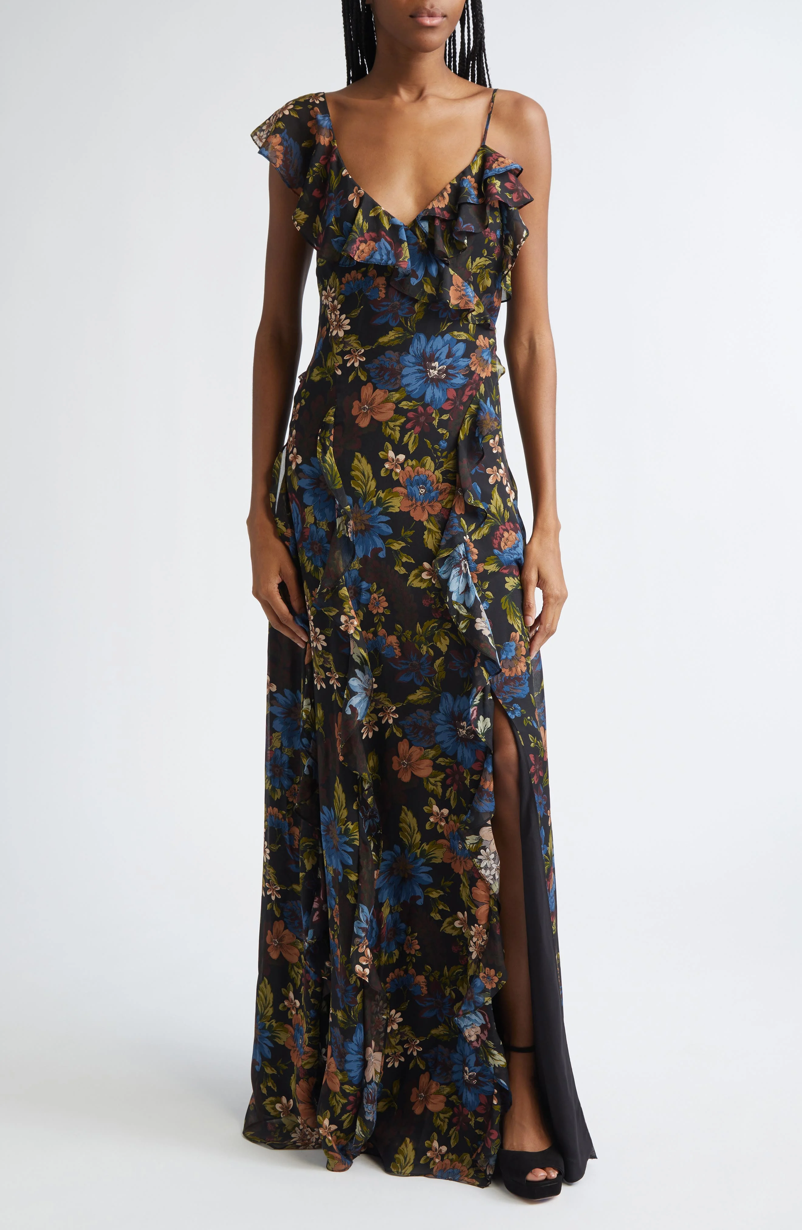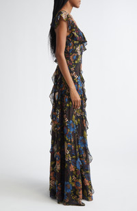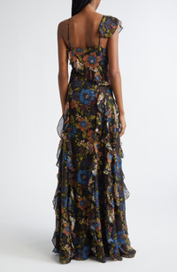 Cut from luxe silk, this romantic gown is covered in moody blooms and trimmed with floaty ruffles. Asymmetric straps add dimension to this evening-out look. V-neck Sleeveless Lined 100% silk Dry clean Imported