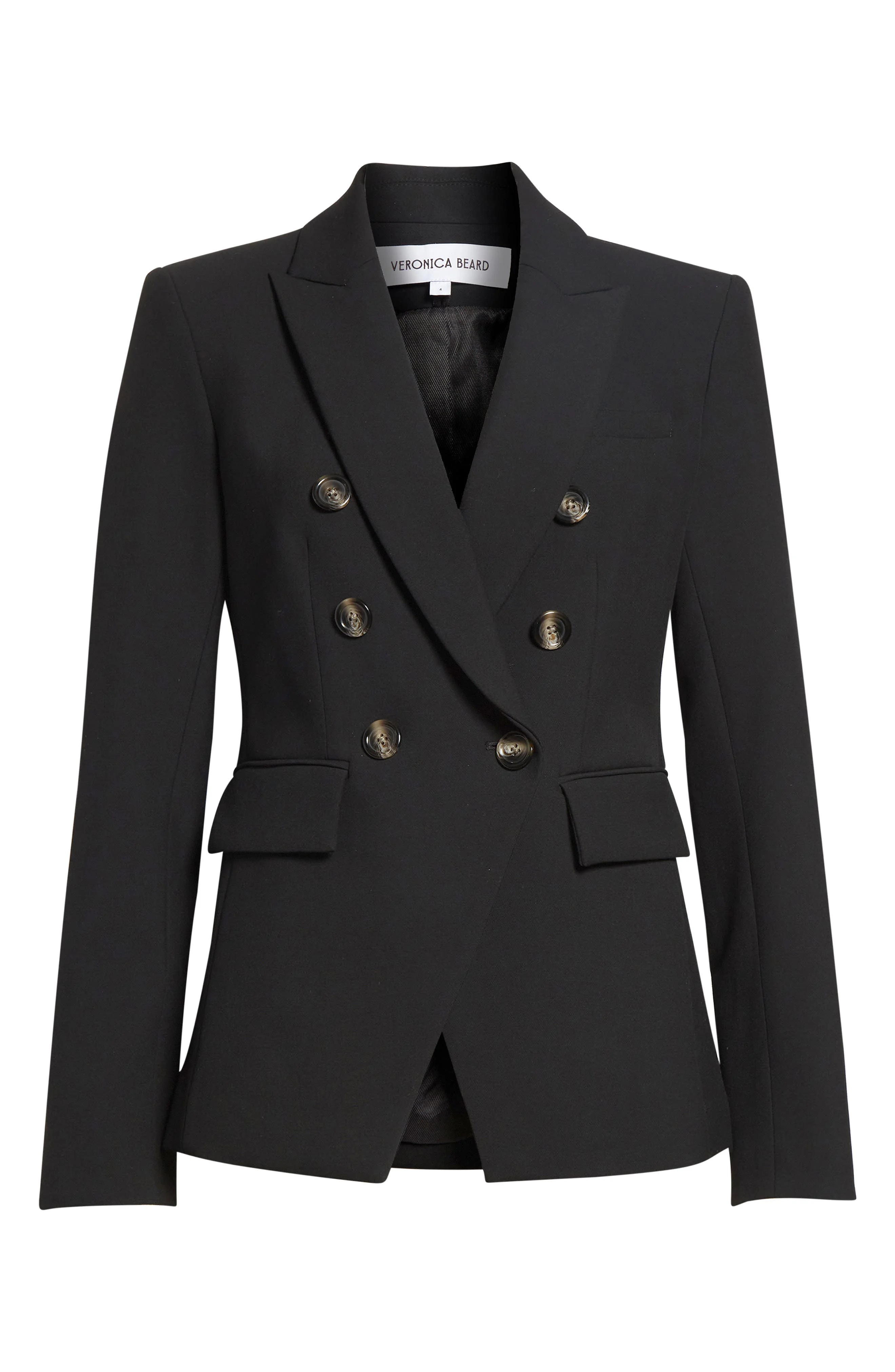 Meet the Miller, Veronica Beard's best-selling dickey jacket—lauded for its flattering slim fit and layering possibilities. This double-breasted cutaway blazer is fashioned from comfortable stretch crepe, then decorated with a regimental array of tortoiseshell-patterned buttons. Double-breasted button closure Peaked lapels Chest welt pocket; front flap pockets Five-button cuffs Back vent Lined Compatible with all Veronica Beard dickeys (sold separately) 63% polyester, 27% viscose, 7% cotton, 3% elastane Dry clean Made in the USA or imported