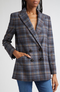 The brand's beloved jacket silhouette is offered in a low-key plaid, closed with classic braided buttons and cut from a wool-forward fabric. Double-breasted button closure Peaked lapels Four-button cuffs Chest welt pocket; front welt pockets Lined Compatible with all Veronica Beard dickeys (sold separately) 58% wool, 30% polyester, 9% polyamide, 3% other fibers Dry clean Imported