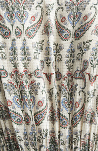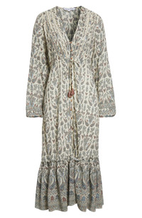 A swirling paisley print and pleated bodice add charming detail to this midi dress cinched with a tie waist and framed by a softly ruffled hem. Slips on over head V-neck Long sleeves Front button closure; ties at front Drawstring waist 70% viscose, 30% cotton Dry clean Made in India