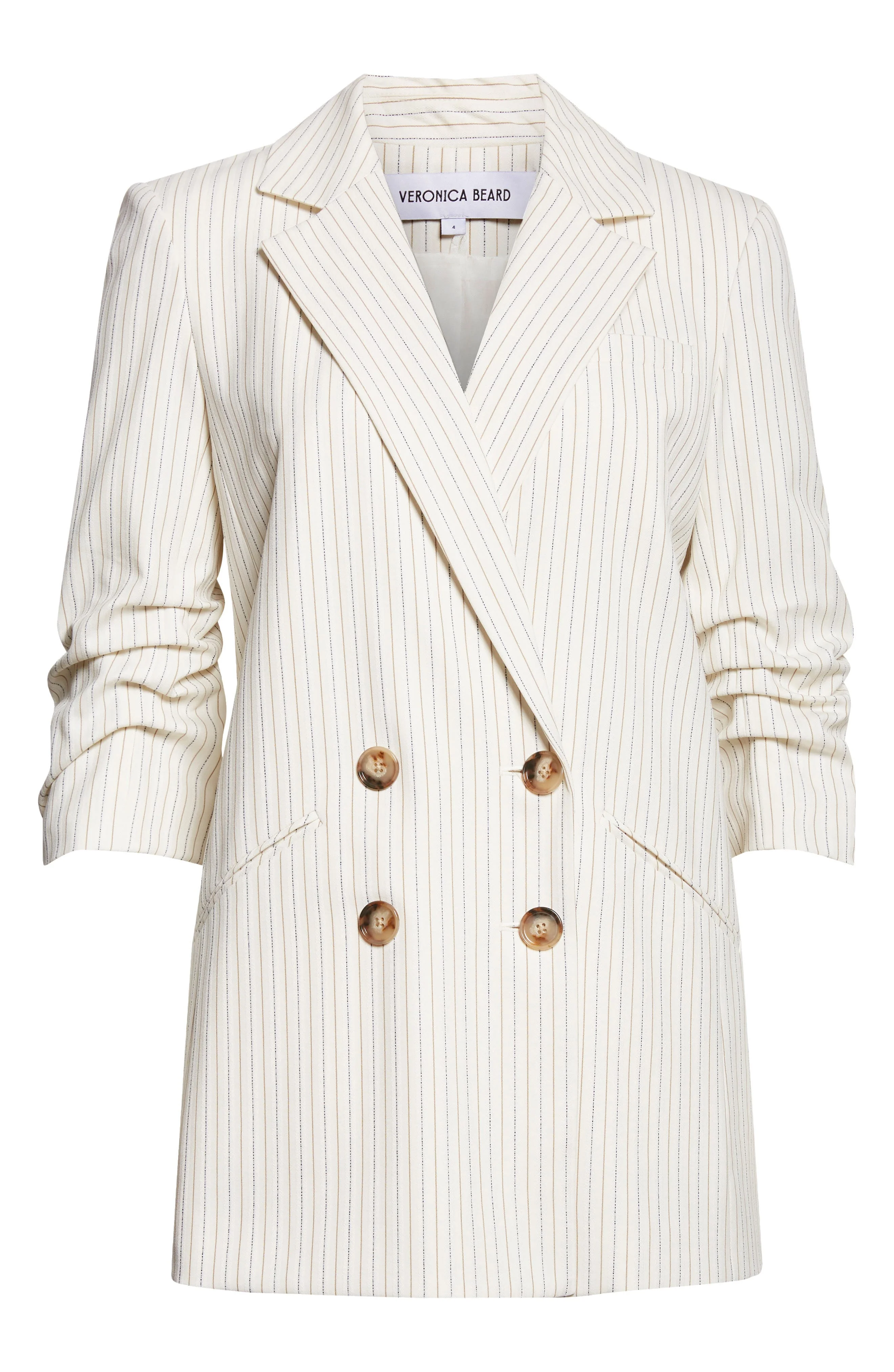 A mix of metallic pinstripes adds a dash of dazzle to the brand's signature jacket silhouette. Double-breasted button closure Notched lapels Four-button cuffs Front welt pockets Compatible with all Veronica Beard dickeys (sold separately) 67% polyester, 29% viscose, 4% elastane Dry clean Imported