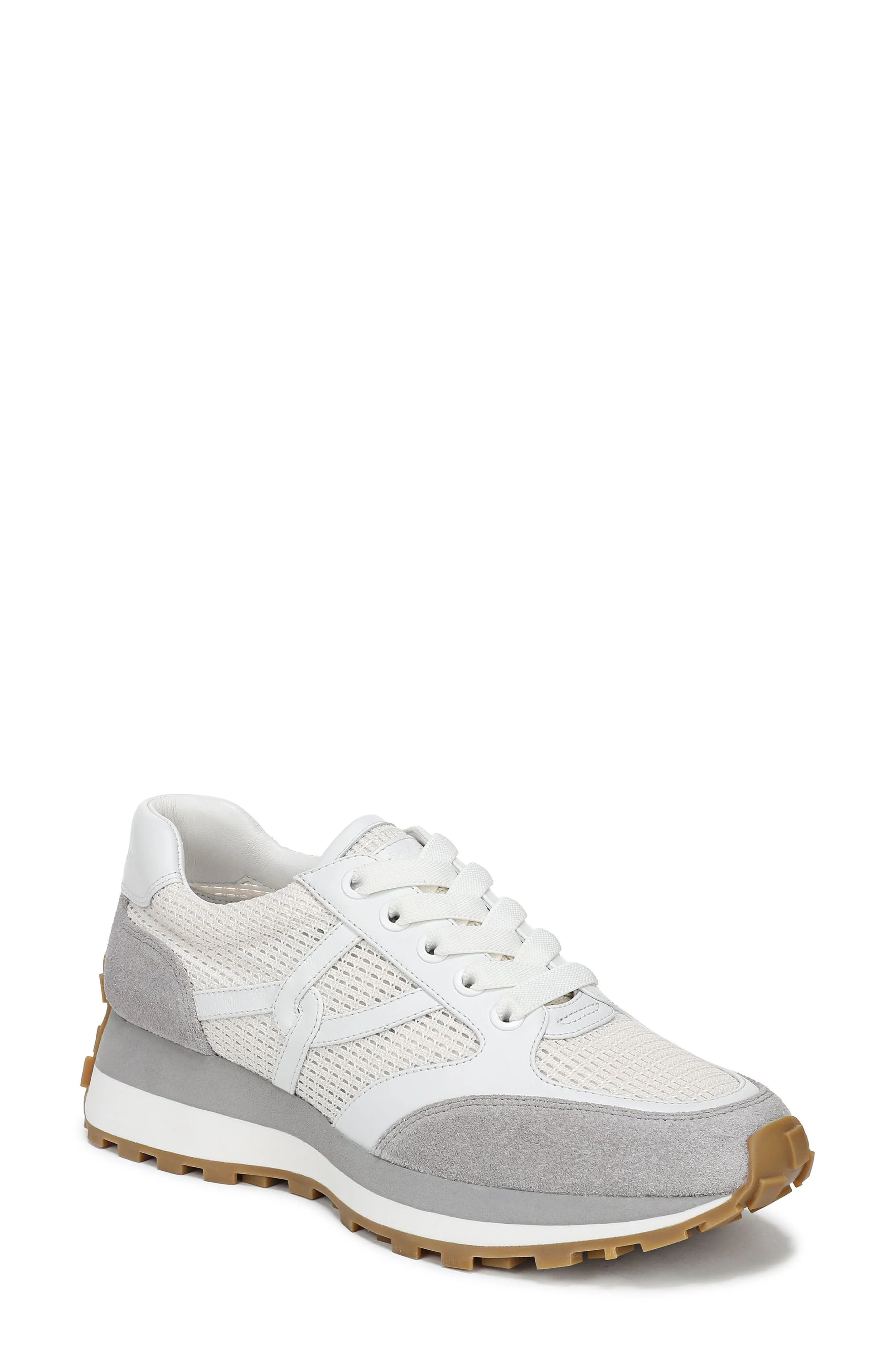 This chunky colorblocked sneaker is set on a grippy rubber sole with boxy lugs that extend up the toe and heel to offer firm grounding. Slip-on style with elastic lacing Removable insole Textile upper/leather lining/rubber sole Imported