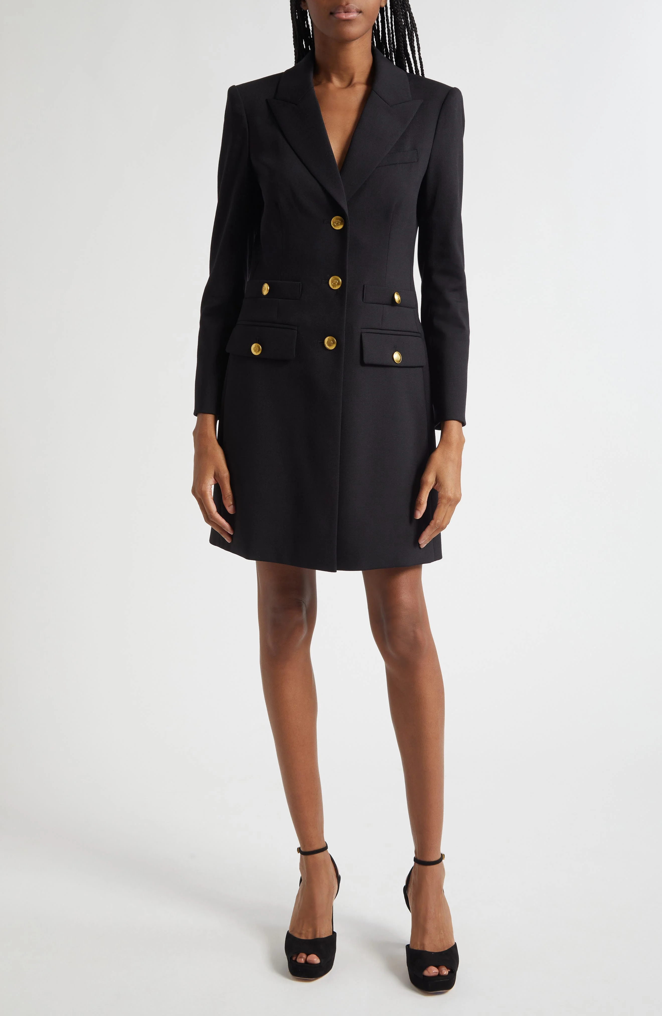 Glinting buttons add high-shine polish to this Italian-made blazer-dress made from stretch-kissed virgin wool. Double-breasted button closure Peaked lapels Five-button cuffs Chest welt pocket; front button welt pockets; front button flap pockets 98% virgin wool, 2% elastane Dry clean Made in Italy