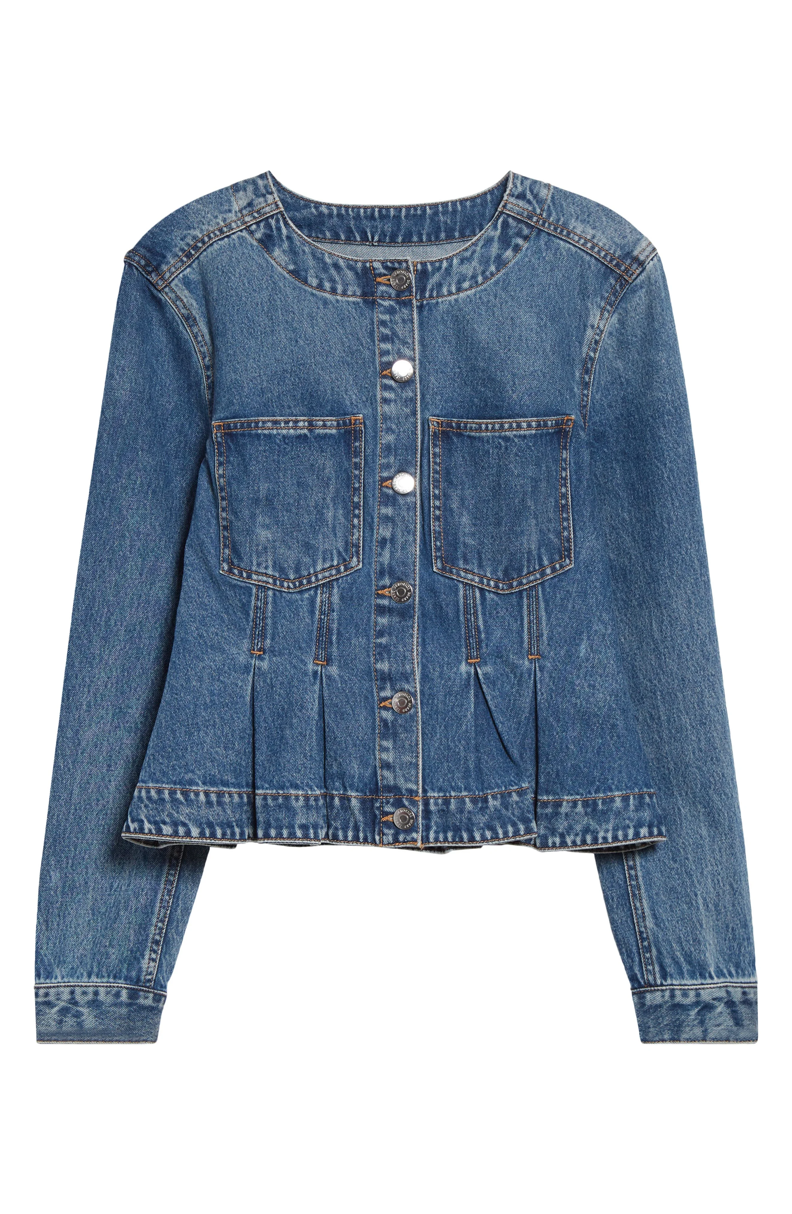 Do denim jacket day differently in an all-cotton option turned to the perfect fade and pleated into a peplum finish. Front button closure Collarless Chest patch pockets 100% cotton Machine wash, line dry Imported