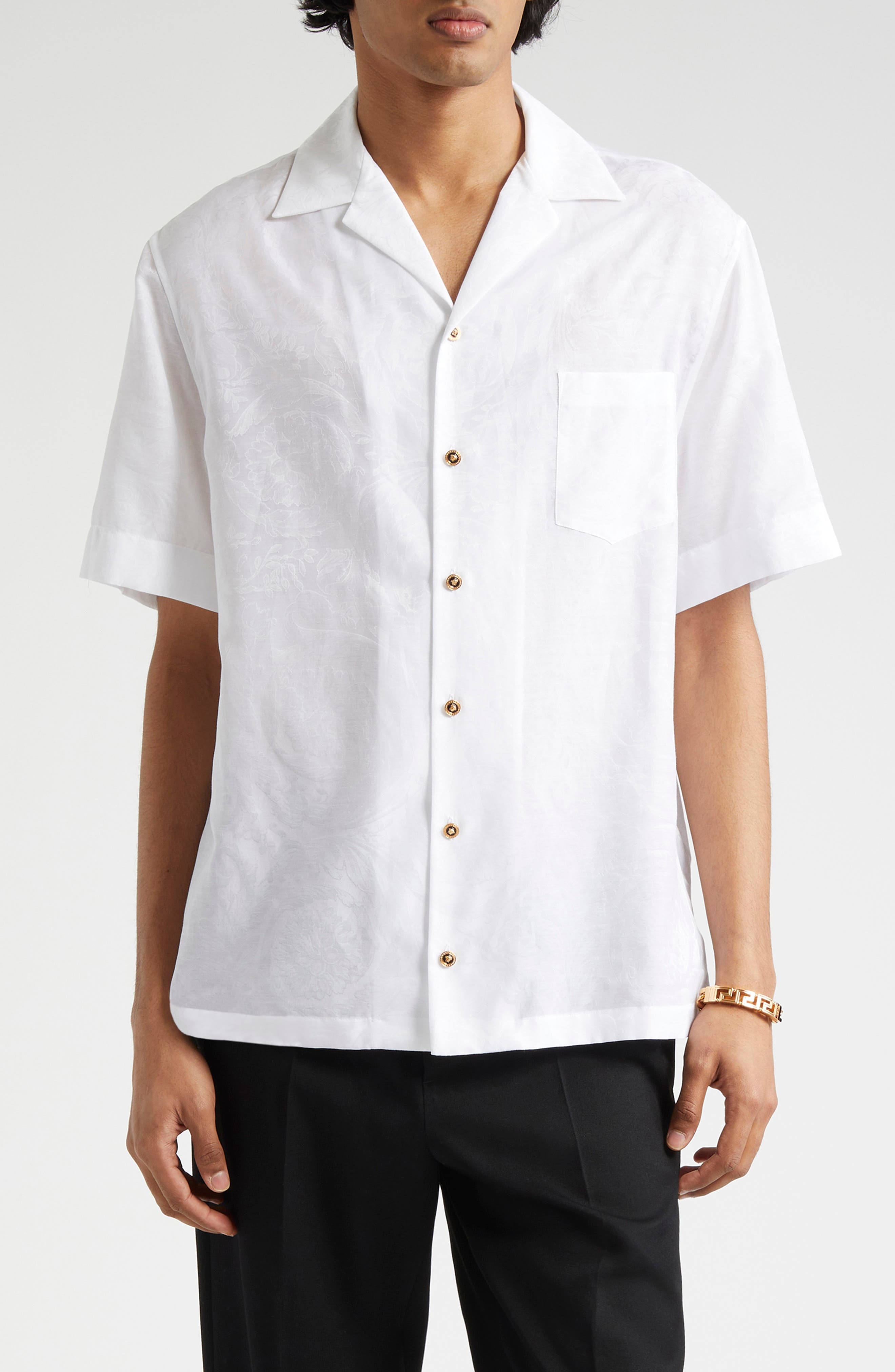 Shining Medusa-head buttons bring Versace's signature brash glamour to this camp shirt crafted of silk-enriched jacquard in a tonal Barocco pattern. 28" length; 42" chest (size 48 EU) Front button closure Notched collar Short sleeves Chest patch pocket 67% cotton, 33% silk Dry clean Made in Italy Designer Clothing