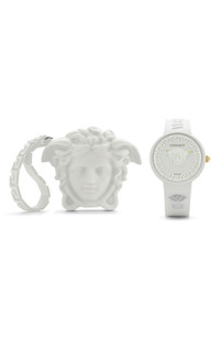A 3D Medusa head centers the dial of a 'populent' watch with a case and strap crafted from debossed matte silicone and featuring Swiss quartz movement.Measurements: 39mm case; 18mm band widthMovement: Swiss quartzFace: Sapphire crystal Silicone Swiss made