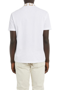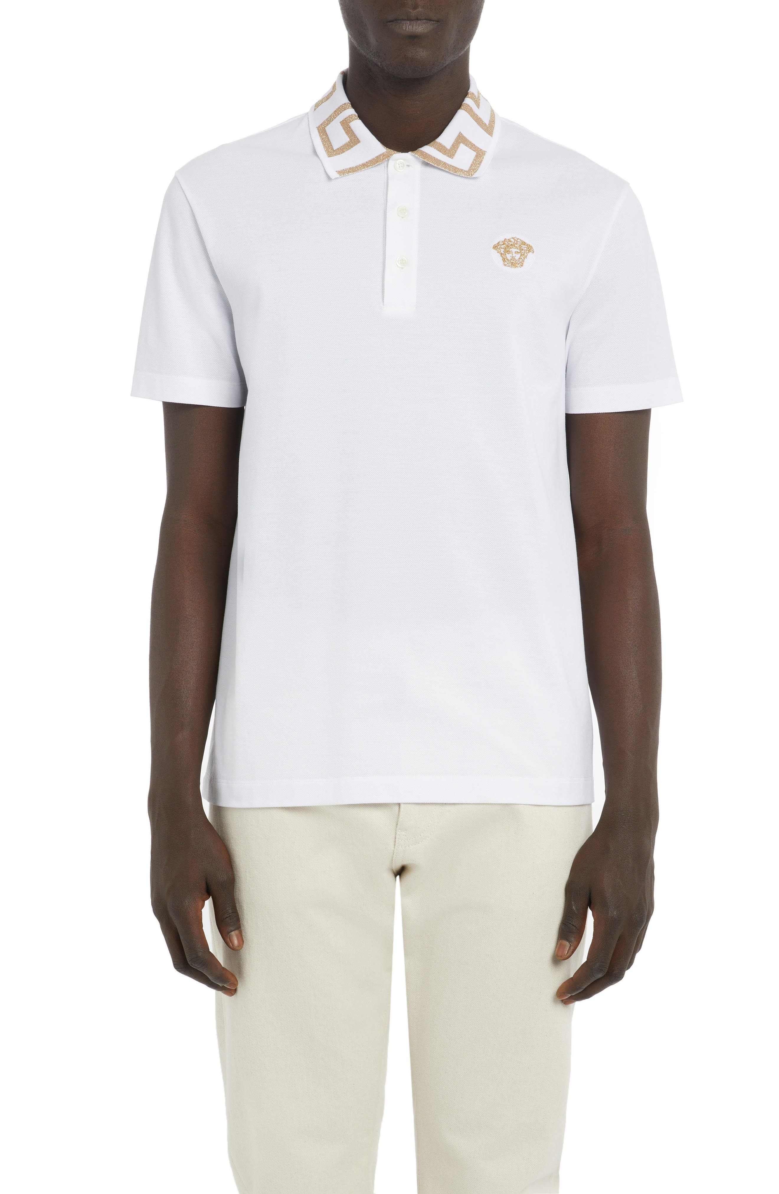 Glimmering Greek-key patterning highlights the spread collar on this cotton-blend piqué polo further refined with an embroidered Medusa head at the chest. 28 1/2" length (size Medium) Spread collar Short sleeves 60% polyester, 40% viscose Machine wash, dry flat Imported Men's Designer Clothing