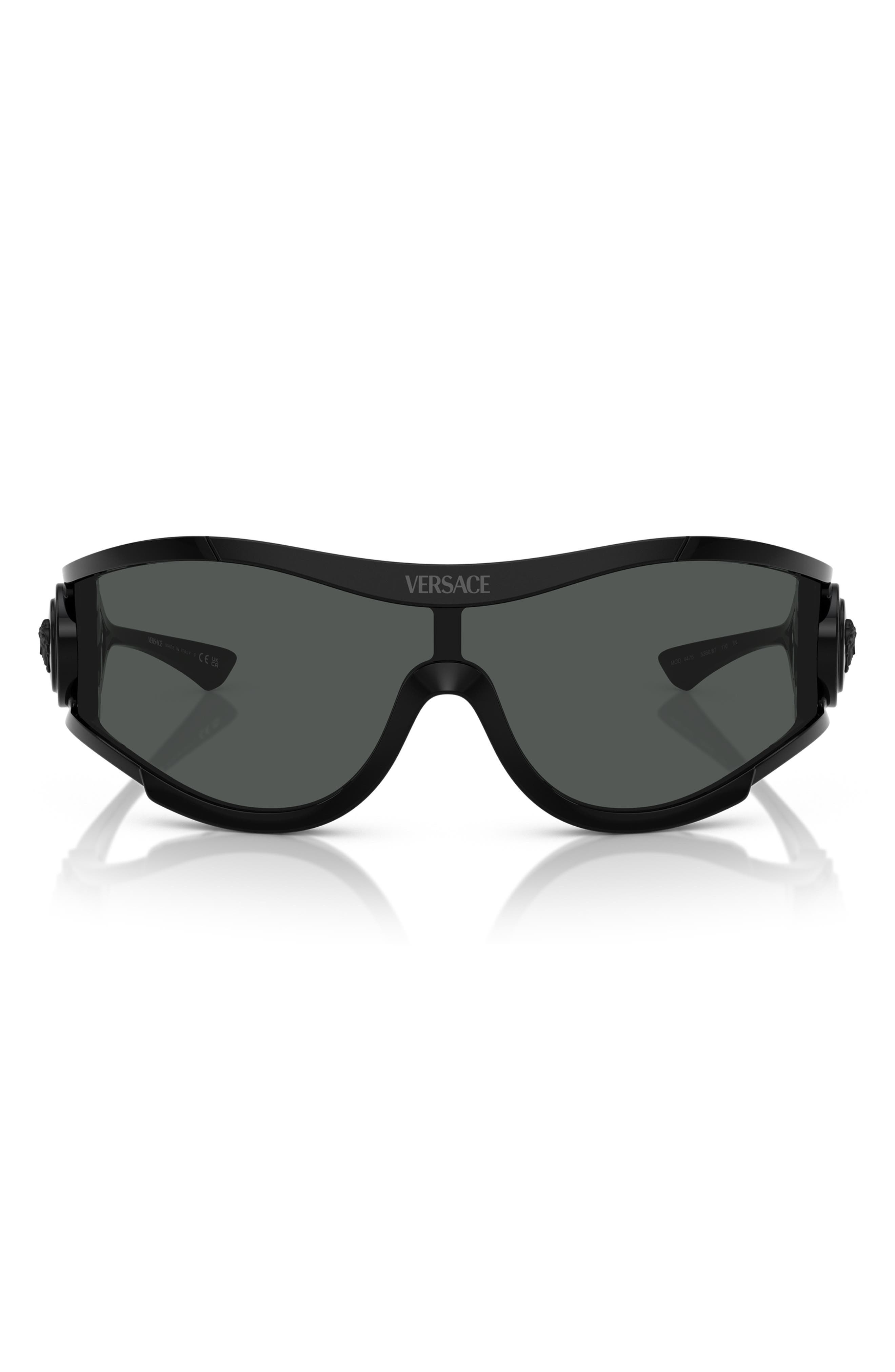 Ultramodern wraparound frames bring bold style to these Italian-made sunglasses fashioned with signature Medusa medallions gleaming at the temples. 180mm lens width; 14mm bridge width; 110mm temple length 100% UV protection Plastic Made in Italy
