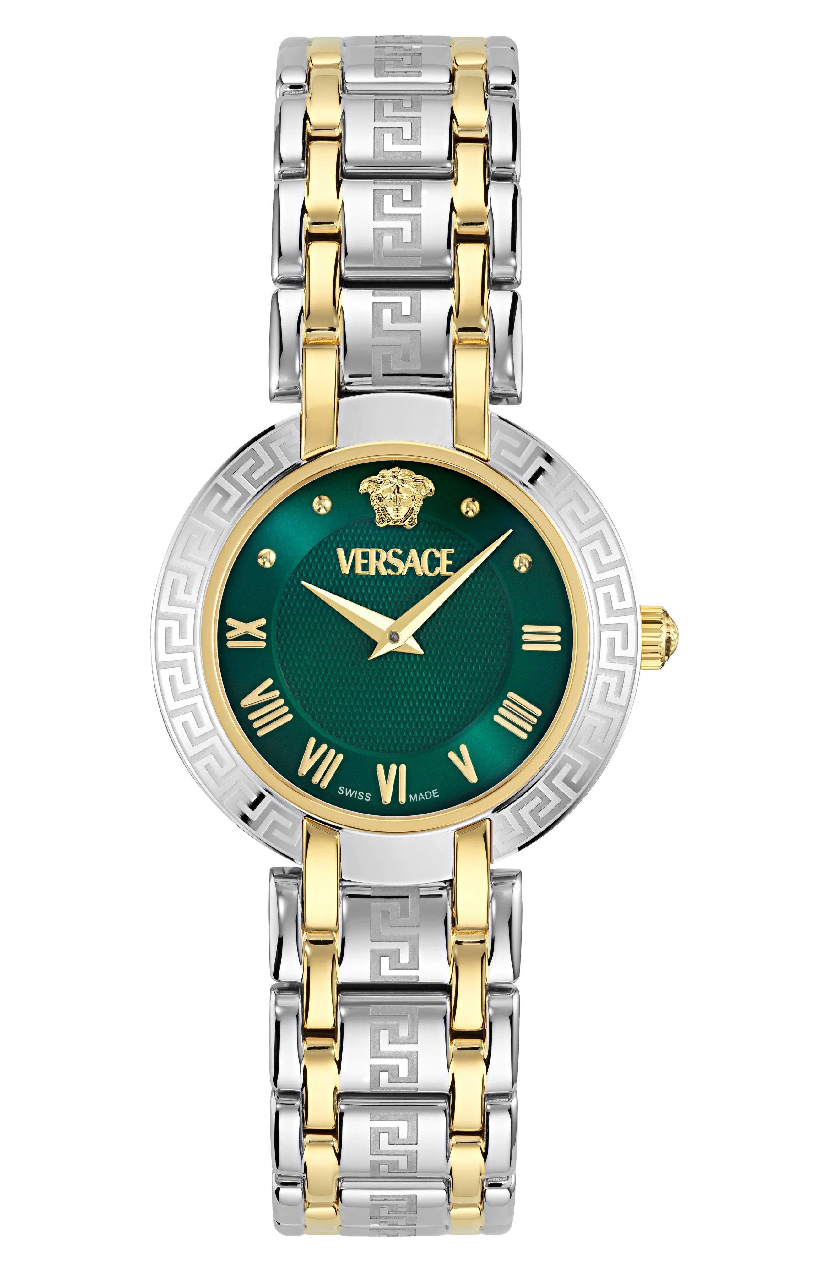 The brand's Greek key motif echoes around the topring and highlights the emerald guilloche dial on this elegant Swiss-made watch punctuated with an iconic 3D Medusa head and set on a mixed-finish bracelet.Measurements: 34mm case; 13mm band width.Strap/closure: Bracelet strap with deployant clasp closure.Movement: Two-hand Swiss quartz movement. Quartz movement: powered by a battery and features an internal electrical circuit to control the rate of the watch's ticking.Other features: Guilloche dial.Face: Sapphire crystal face. Recycled stainless steel/goldtone plate Swiss made