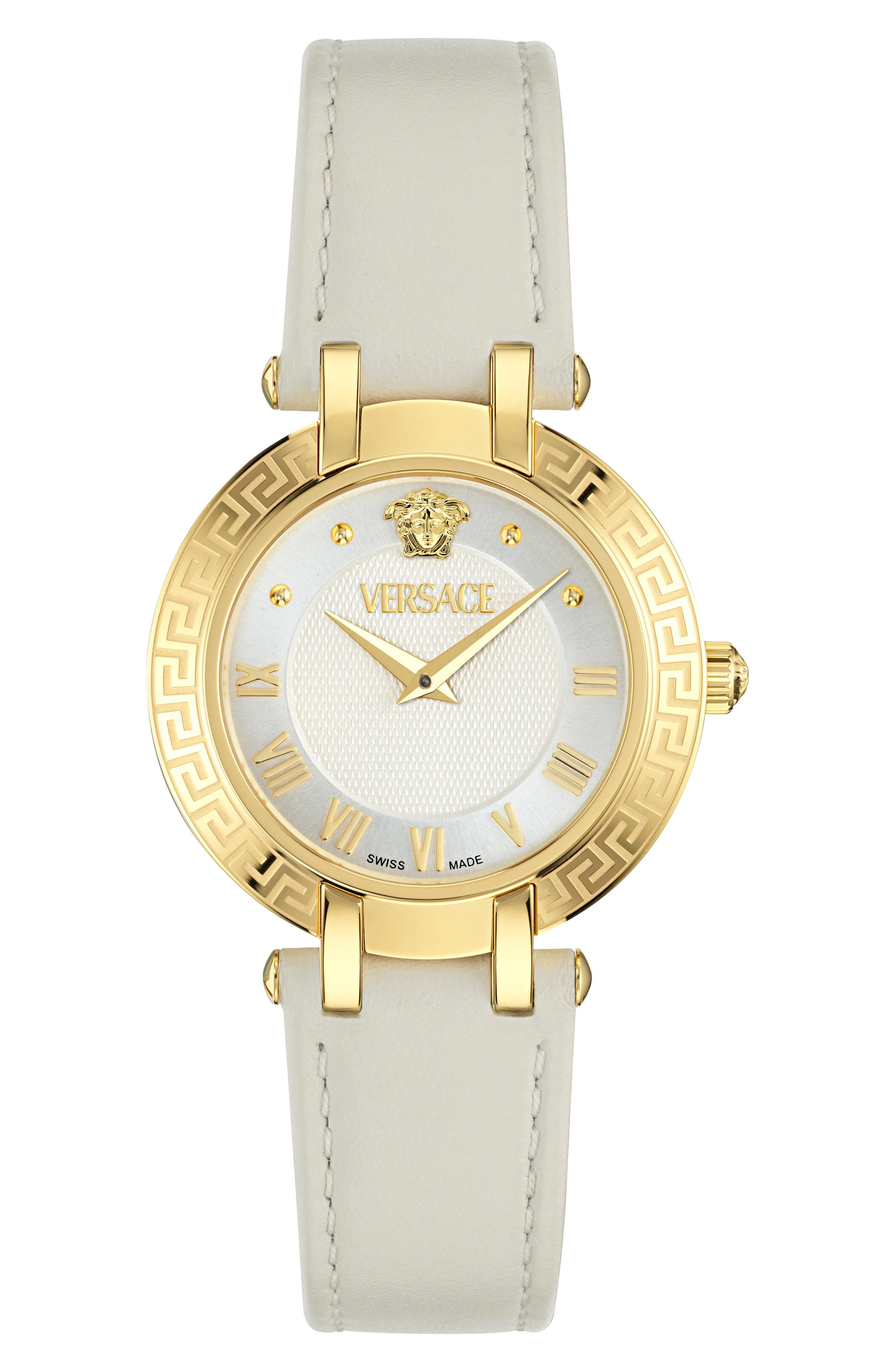 The brand's Greek key motif echoes around the topring and highlights the bright guilloche dial on this elegant Swiss-made watch punctuated with an iconic 3D Medusa head and set on an adjustable leather strap.Measurements: 34mm case; 13mm band width.Strap/closure: Leather strap with adjustable buckle closure.Movement: Two-hand Swiss quartz movement. Quartz movement: powered by a battery and features an internal electrical circuit to control the rate of the watch's ticking.Other features: Guilloche dial.Face: Sapphire crystal face. Recycled stainless steel with goldtone ionic plate/leather Swiss made