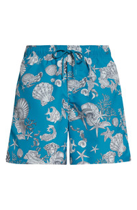 Versace's baroque pattern makes a splash on these statement swim trunks, where the maison's instantly recognizable Greek icons meet undersea motifs for an unforgettable poolside look. Elastic/drawstring waist Side-seam pockets; back zip pocket Mesh liner 100% polyester Hand wash, line dry Made in Italy Designer Clothing