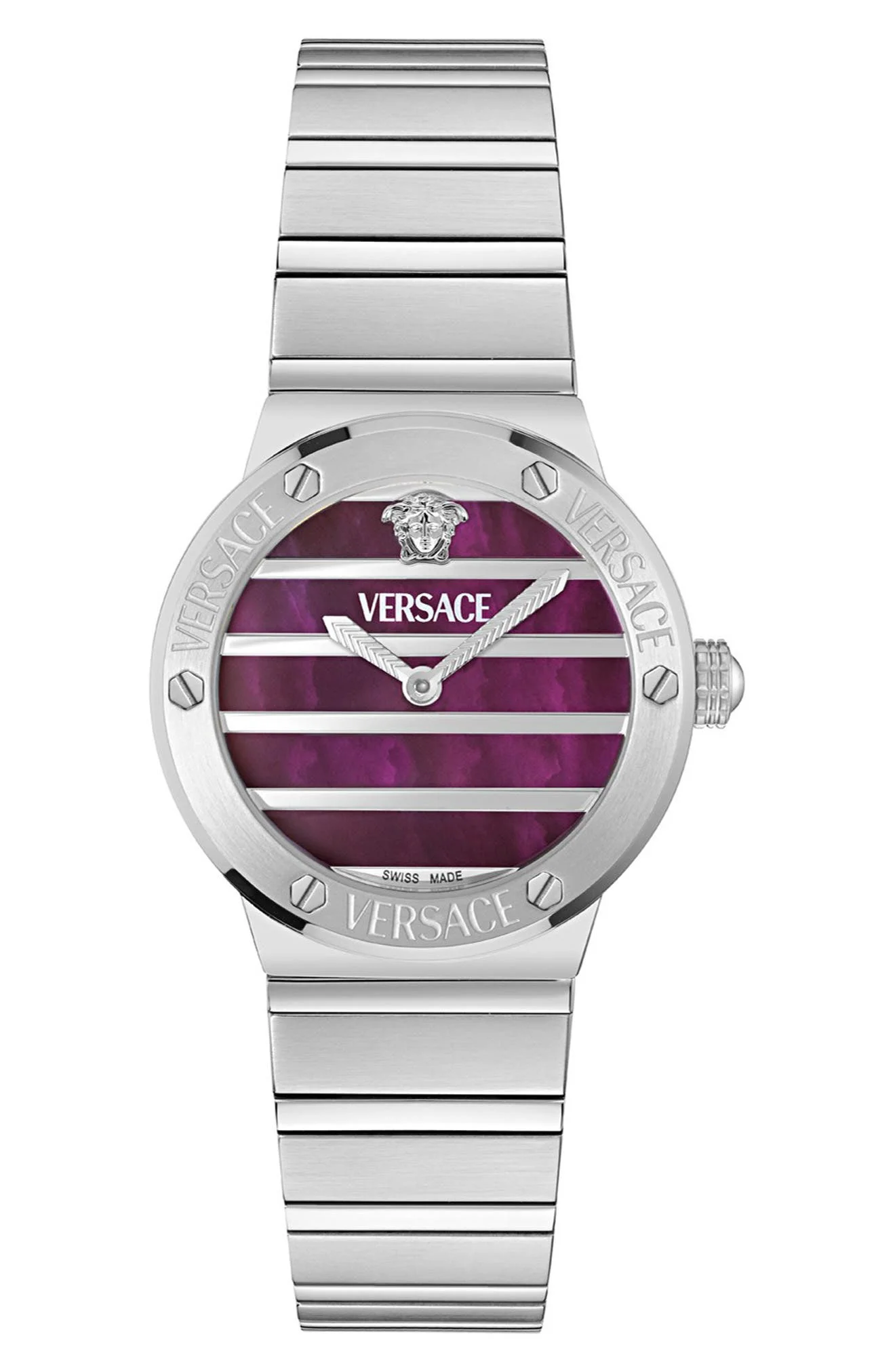 A luminous mother-of-pearl dial is striped by the industrial-chic overlay on this simple, bold bracelet watch featuring, as ever, the iconic Medusa head in the 12-o'clock position.Measurements: 33mm case; 10mm band width.Strap/closure: Bracelet strap with deployant clasp closure.Movement: Two-hand RONDA 762E.3 Swiss quartz movement. Quartz movement: powered by a battery and features an internal electrical circuit to control the rate of the watch's ticking.Other features: Screw-in bezel; mother-of-pearl dial.Face: Sapphire crystal face. Stainless steel or stainless steel with 18k-gold plate/mother-of-pearl Swiss made