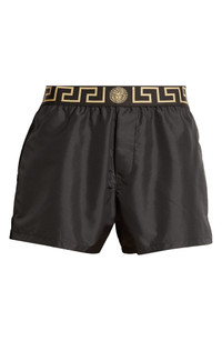 The house's Greca key motif and a Medusa head on the stretchy waistband lend a heritage signature to Italian-crafted swim trunks cut in a modern silhouette. Elastic waist 100% polyester with 82% polyester, 9% polyamide, 9% elastane contrast Machine wash, line dry Made in Italy Designer Clothing