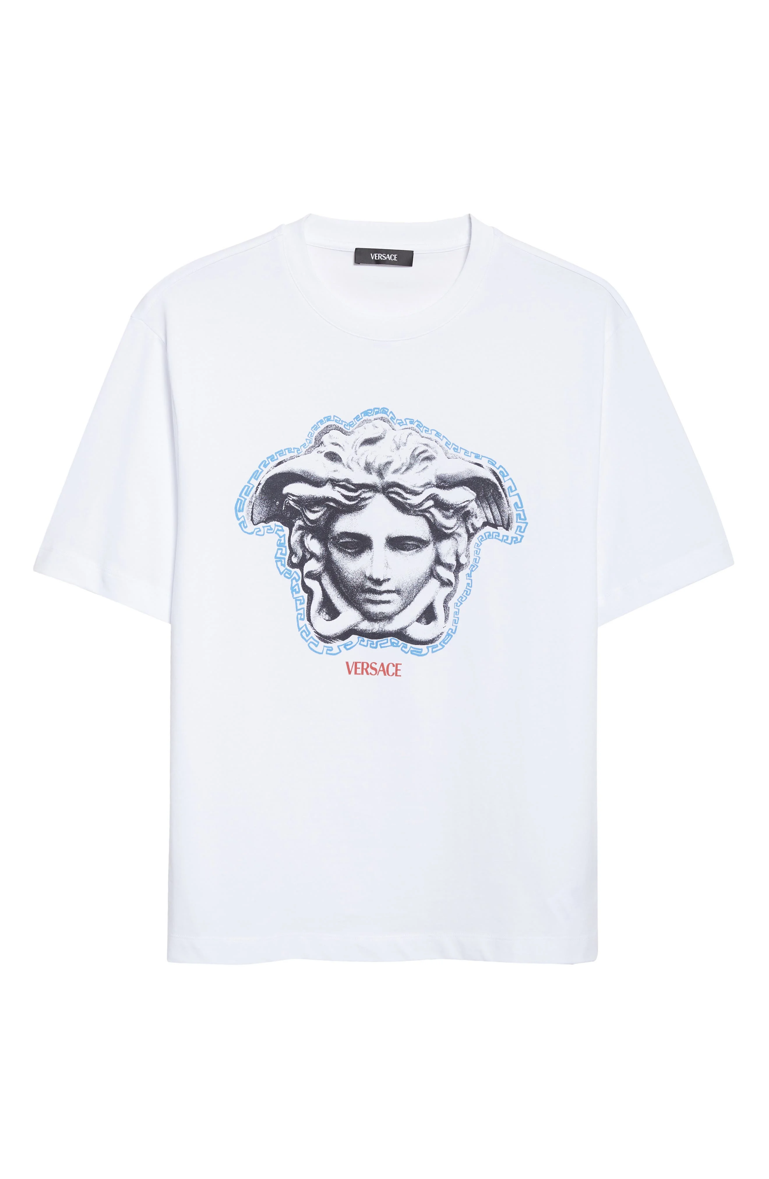 House codes collide on this Italian-cotton jersey T-shirt, where Versace's Greek-key detailing outlines the signature Medusa-head mascot—a nood to the molded door of the maison's first headquarters. Crewneck Short sleeves 100% cotton Dry clean Made in Portugal Designer Clothing