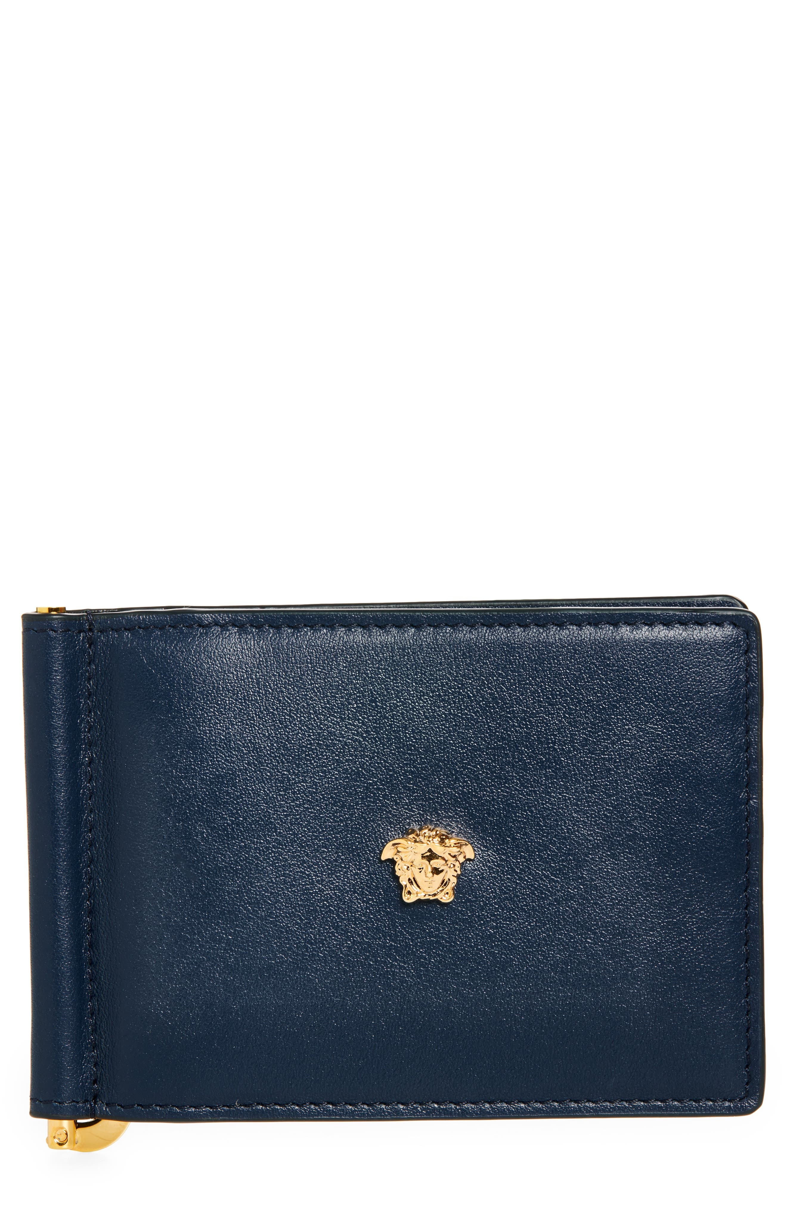 Versace Medusa Money Clip Leather Bifold Wallet in Midnight Blue-Versace Gold at Nordstrom
