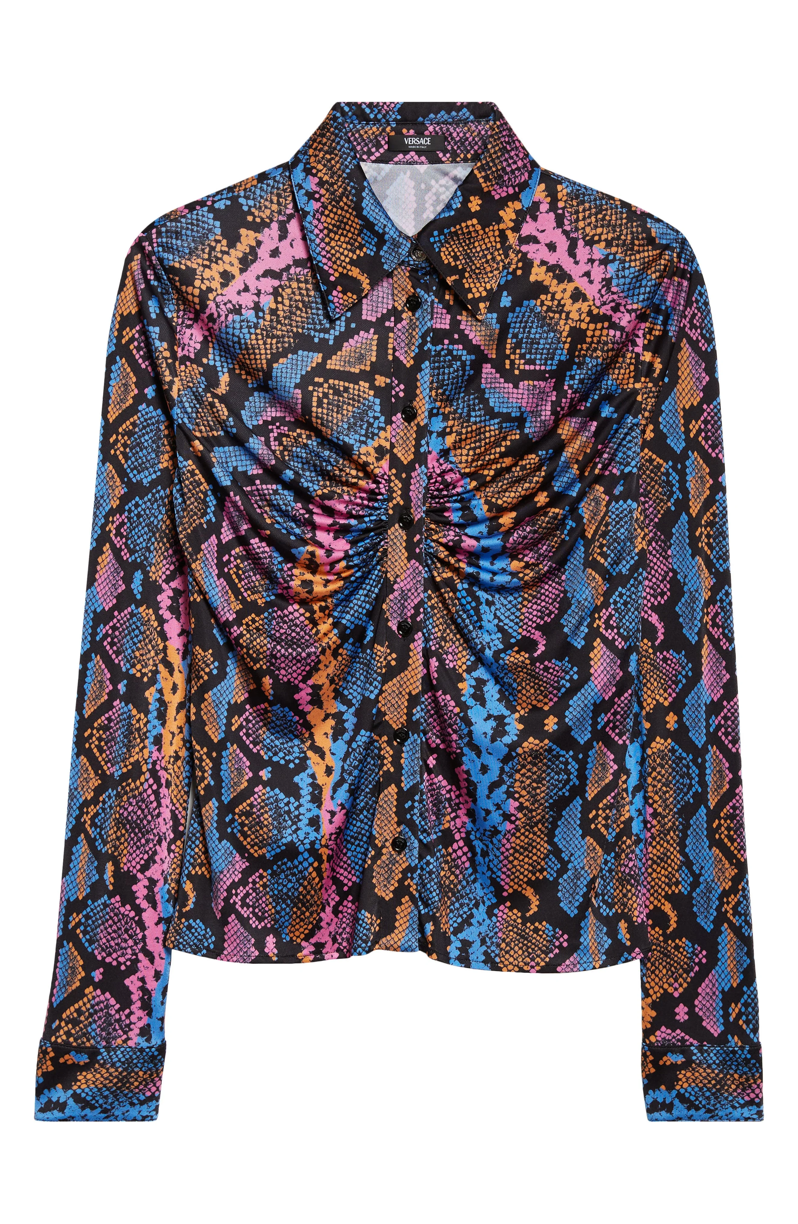 Polished Medusa-head hardware—a nod to the molded door of Versace's first headquarters—shines against a kaleidoscopic snakeskin print on this artfully gathered shirt fashioned from smooth Italian jersey. Front button closure Point collar Long sleeves with button cuffs 100% viscose Dry clean Made in Italy Designer Clothing