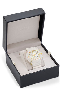 Medusa-head hardware at the 12-o'clock hour and crown adds a house-signature touch to the dial of this robust chronograph fitted with a bracelet-style TPU strap.Measurements: 45mm case; 27mm band width.Strap/closure: Synthetic strap with adjustable buckle closure.Movement: Three-hand Swiss quartz movement. Quartz movement: powered by a battery and features an internal electrical circuit to control the rate of the watch's ticking.Complications: Date window; elapsed-seconds, -minutes and -hours subdials.Face: Sapphire crystal face. Stainless steel/TPU Swiss made