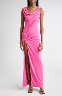Artful draping contours to your curves in this statuesque crepe gown decorated with polished safety-pin hardware borrowed from an iconic red-carpet moment in '94. Hidden side-zip closure Cowl neck Sleeveless Front slit 95% viscose, 5% elastane Dry clean Made in Italy Designer Clothing