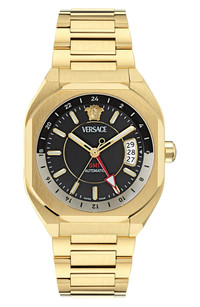 A brushed-finish case and heavy-duty steel bracelet bring rugged durability to this Swiss-automatic timepiece detailed with a house-signature Medusa head.Measurements: 40mm case; 20mm band width.Strap/closure: Steel bracelet with deployant clasp closure.Movement: Three-hand Swiss automatic movement. Automatic movement: has the ability to automatically wind and recharge movement through natural motions of the wearer’s wrist or when stored in a watch winder.Complications: Date window.Other features: Exhibition caseback.Face: Sapphire crystal face. Stainless steel with goldtone plate Swiss made
