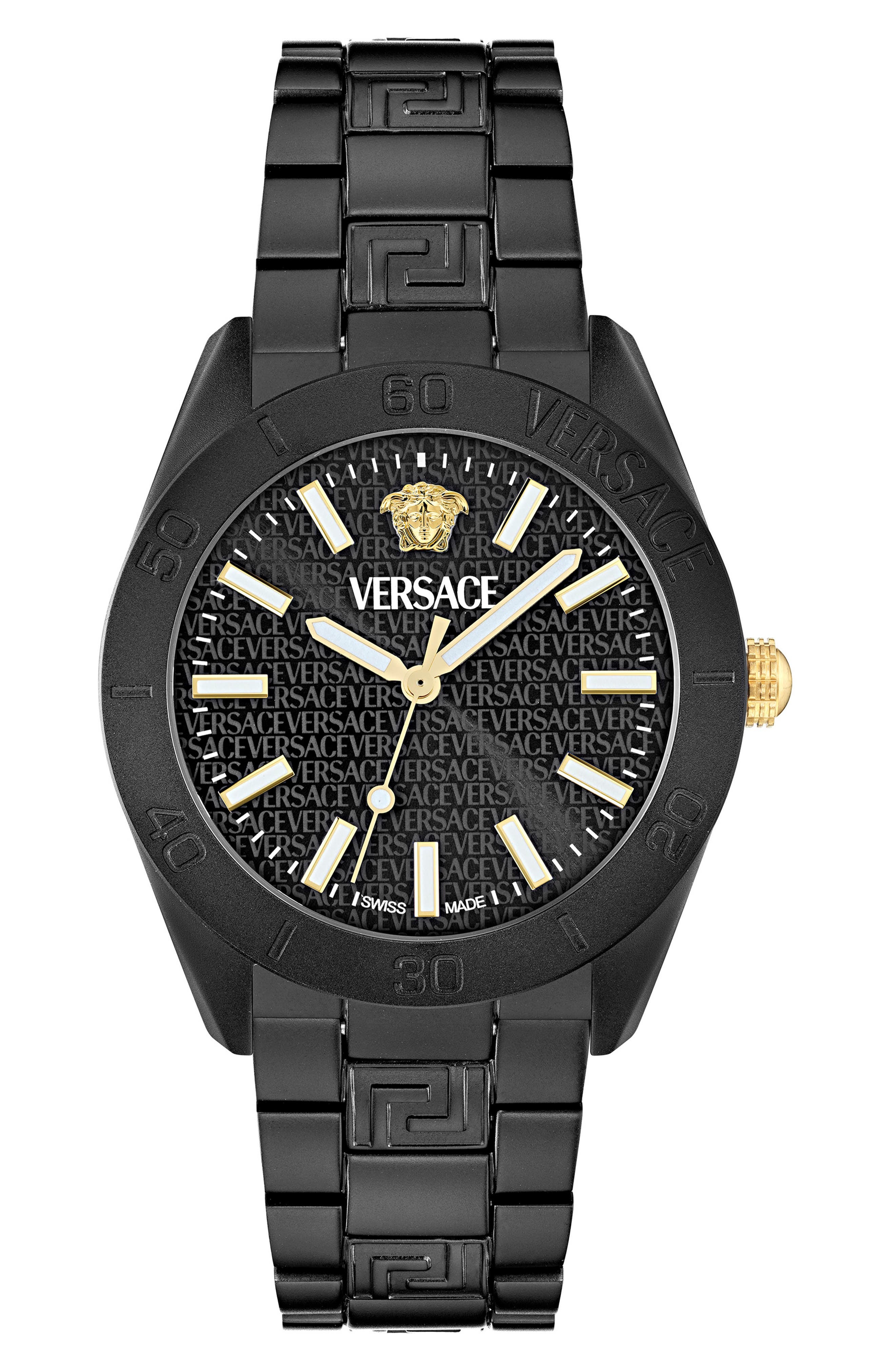 An iconic Medusa head and logo-debossed guilloche dial elevate a Swiss-made watch set on an aluminum bracelet for exceptional durability.Measurements: 42mm case; 17mm band width.Strap/closure: Bracelet strap with deployant clasp closure.Movement: Three-hand Swiss quartz movement. Quartz movement: powered by a battery and features an internal electrical circuit to control the rate of the watch's ticking.Other features: Guilloche dial; Super-LumiNova® hands and markers.Face: Sapphire crystal face. Aluminum Swiss made