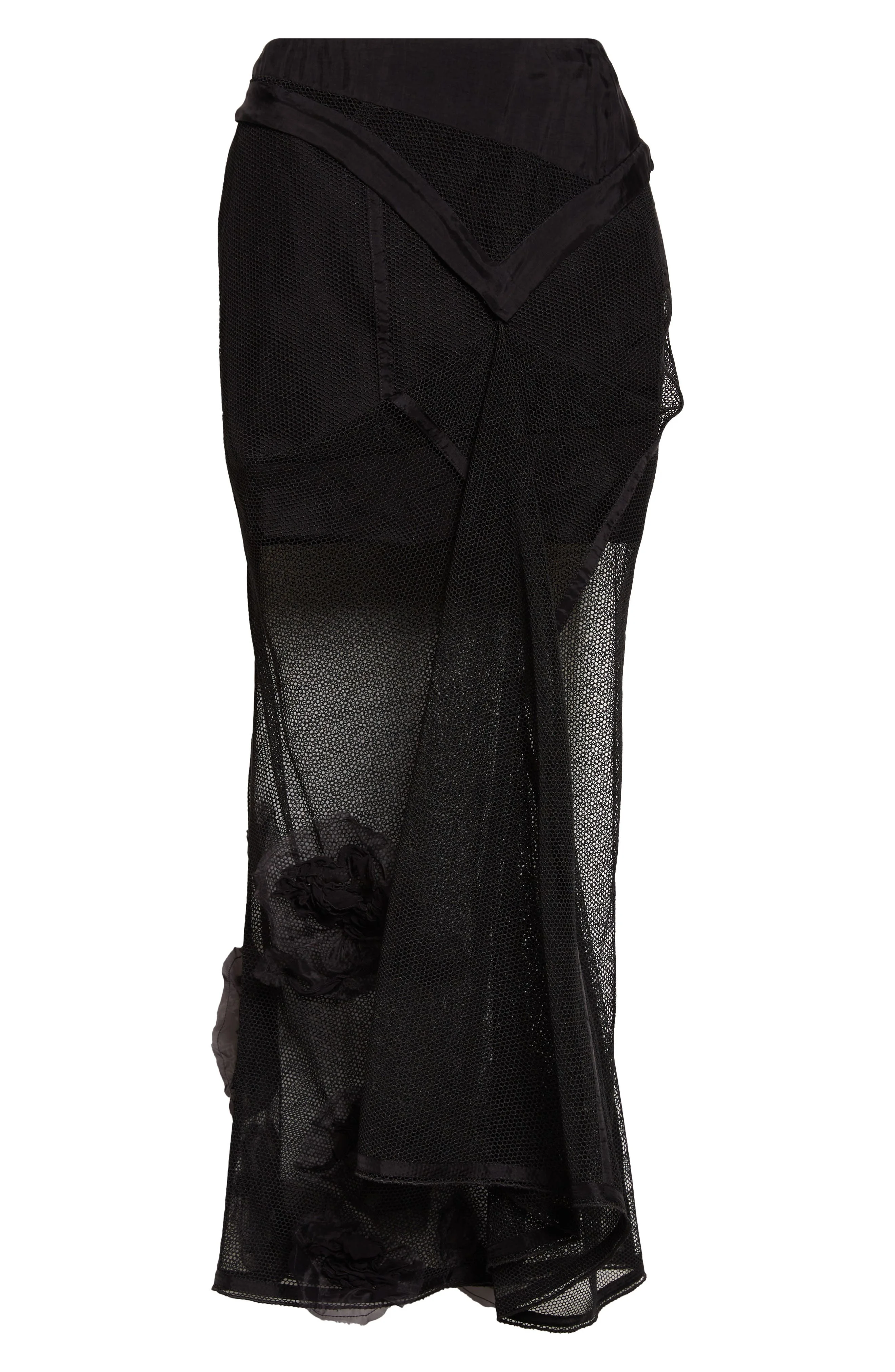 An off-kilter basque waist and 3D floral appliques in crisp organza further the standout appeal of this event-ready skirt made from airy mesh with a crepe de Chine underlayer. Hidden side-zip closure Partially lined 100% polyester Dry clean Imported Designer Clothing