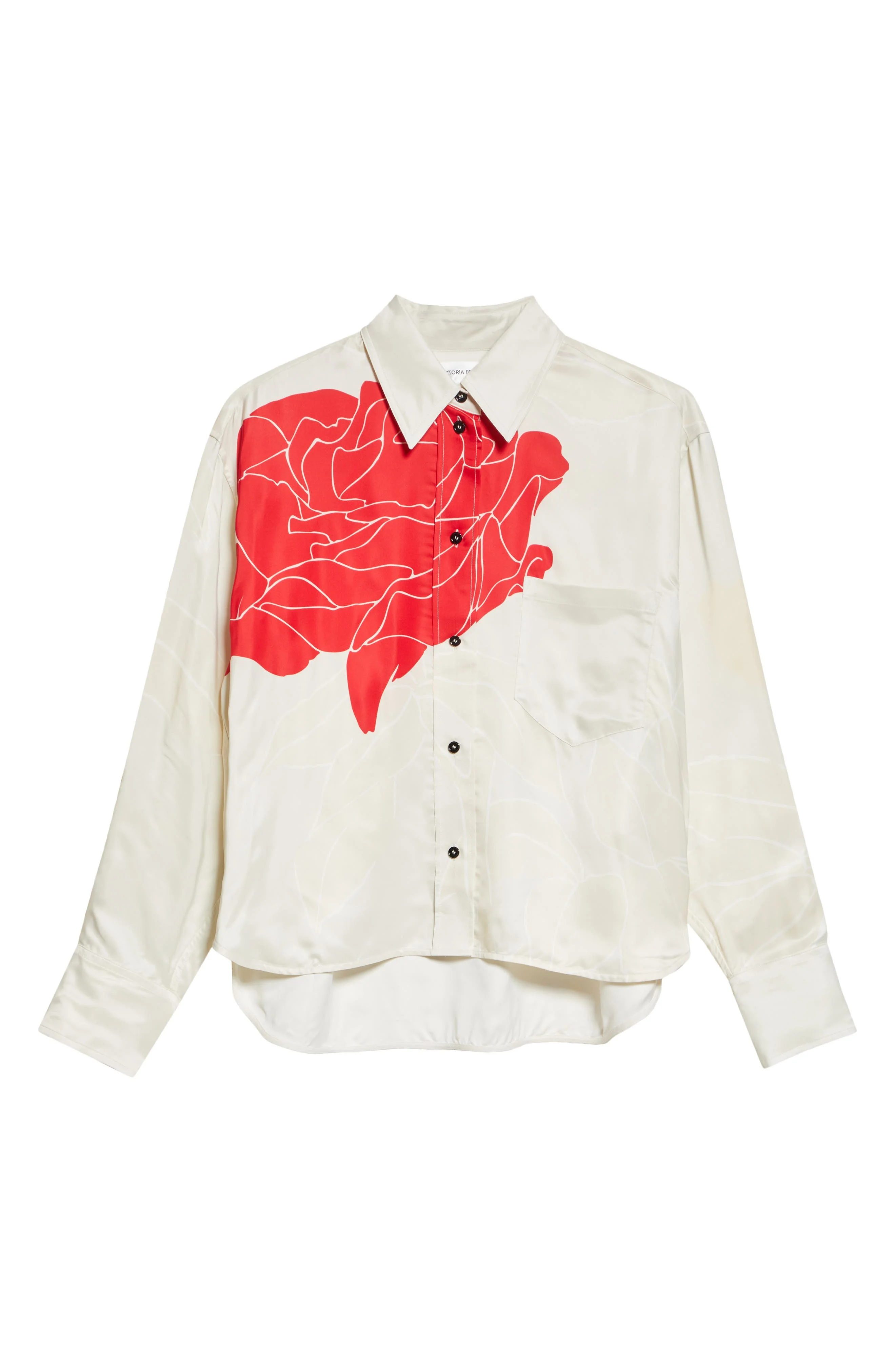 The British designer puts a fresh spin on a classic button-up with this cropped shirt cut in a high-low silhouette and emblazoned with an abstract rose graphic. Front button closure Point collar Long sleeves with button cuffs Chest patch pocket High-low hem 100% viscose Dry clean Made in Portugal Designer Clothing