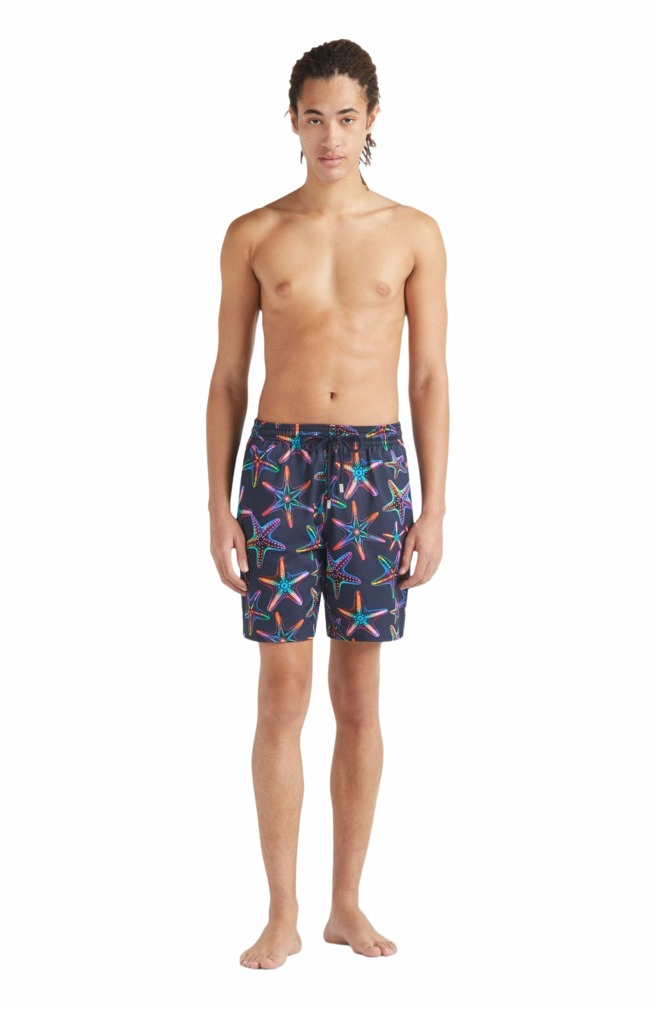 A vibrant pair of swim shorts in this season's eye-catching disco stars design. Featuring back and side pockets and a comfortable elasticated waistband and drawstring finished with Vilebrequin-engraved tips. Board short length swim shorts with stretch fabric Elastic waistband with drawstring and zamak tips engraved Vilebrequin