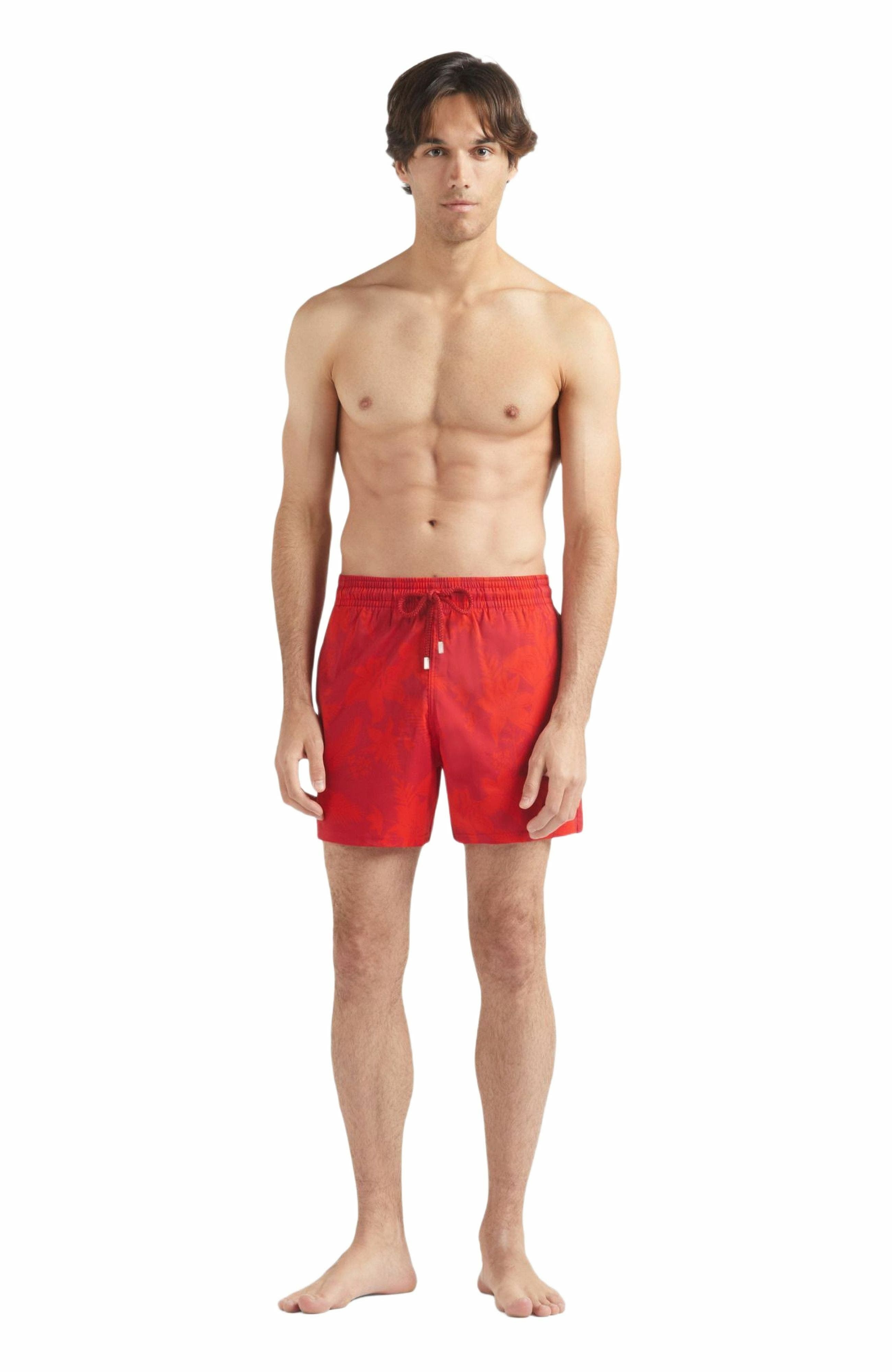 A timeless pair of men's short swim trunks crafted in a tropical-inspired contrast print. Cut in a shorter length and fashioned from Polyester and elastane for a comfortable fit. Shorter length swim shorts with stretch fabric Elastic waistband with drawstring and zamak tips engraved Vilebrequin