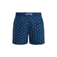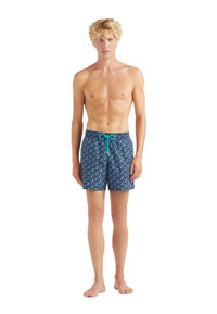 These swim shorts are playfully graphic in an allover print of the iconic Micro Ronde des Tortues Tricolore. Crafted from comfortable recycled polyamide, the Vilebrequin-engraved tips on the drawstring complete the stylish look. *Sizes run small, please refer to our size guide Elastic waistband swimwear with drawstring and Zamac tips engraved Vilebrequin Side pockets Hand-placement of back pocket for perfect visual alignment with swimwear print Two back eyelets allow water to drain and avoid swim trunks from ballooning when emerging into water Fully lined with water-resistant mesh lining (100% polyamide) Side leg length in M: 39.5 cm Fabrics are treated for fast-dry Men Swim shorts Men Swim shorts Micro Ronde Des Tortues Rainbow 100% recycled polyamide