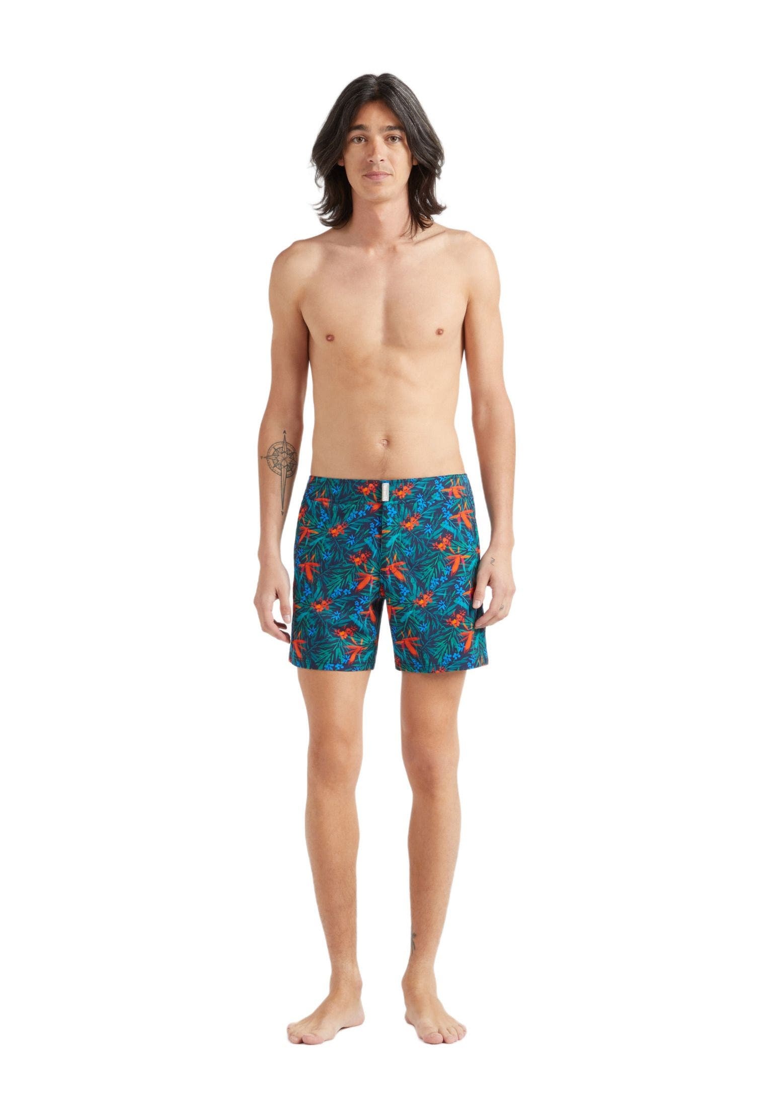 These Tropical Flowers printed swim shorts double up as a summer evening outfit when style is a necessity. Crafted from recycled polyamide and elastane for the perfect fit. Short flat belt swimsuit with Vilebrequin logo snap button and tone on tone zipper Italian side pockets and back pocket with Velcro flap Back seaming shape offers a more natural rear tone and curve Shorter than the classic Moorea Side leg length in size M: 14.7" Inseam for size M: 5.5" The model is 73.6" tall and wears a size M Men Swim Trunks Tropical Flowers Men Swim Trunks 98% recycled polyamide 2% elastane