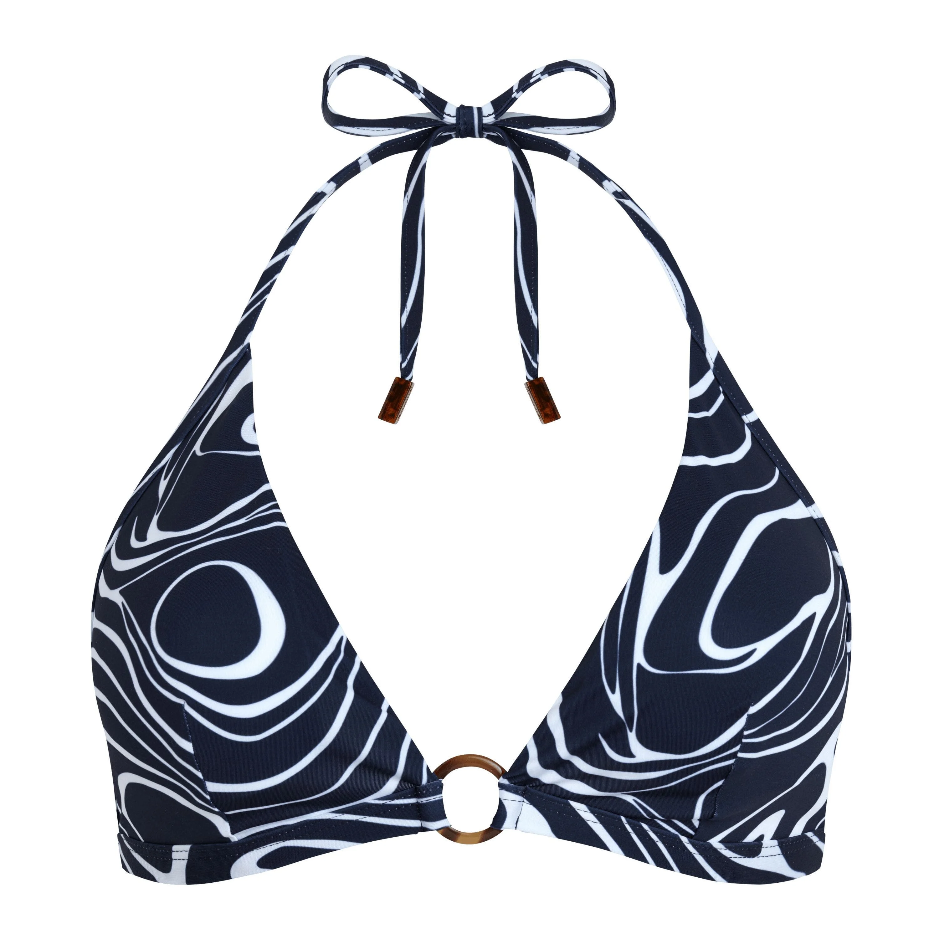 A flattering bikini top structured to enhance the shape. Glamorously styled in stretch jersey and featuring adjustable neck straps, the iconic turtle ring adds the perfect finishing detail. Halter Bikini Top Removable padding cups Adjustable neck straps to be tied with Vilebrequin engraved Turtle scale like tips and back clasp closure Centered ring Turtle scale like Size S measures to a B-cup The model is 175cm and wears a S size Women Bikini Women Bikini Orcas 82% recycled polyamide 18% elastane
