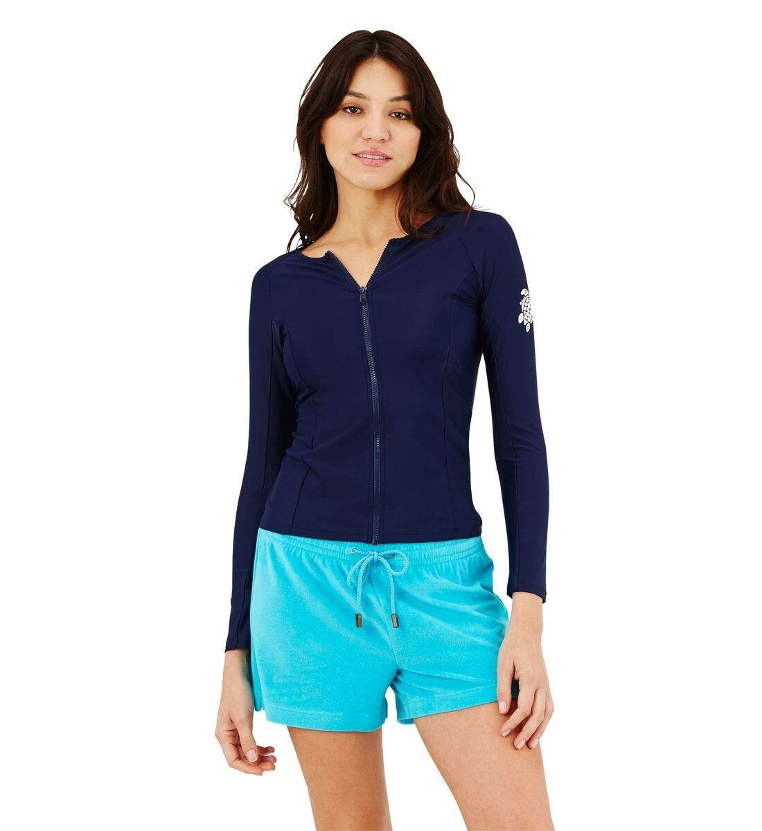 Play with contrasts with the color schemes on this women's UV-resistant plain zip-up T-shirt. This long-sleeved basic features a Vilebrequin turtle printed on one arm like a tattoo. It has a zip at the front and tailored sides. Women Round collar Rasghuard A real protective armour to face the dazzling sun with serenity! Long raglan sleeves UPF50+ Resistance sunscreen and oil Extra resistant Shape retention The model wears a S size Model measurement: Chest 80cm, Height 176cm, Waist 60cm, Hips 90cm Women Rashguard Solid Women Rashguard