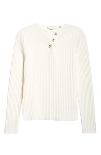 A casually polished sweater is knit with wide ribs from a stretchy, mostly cotton blend. 23" length (size Medium) Button half-placket Jewel neck Long sleeves 78% cotton, 19% polyester, 3% spandex Dry clean or hand wash, dry flat Imported