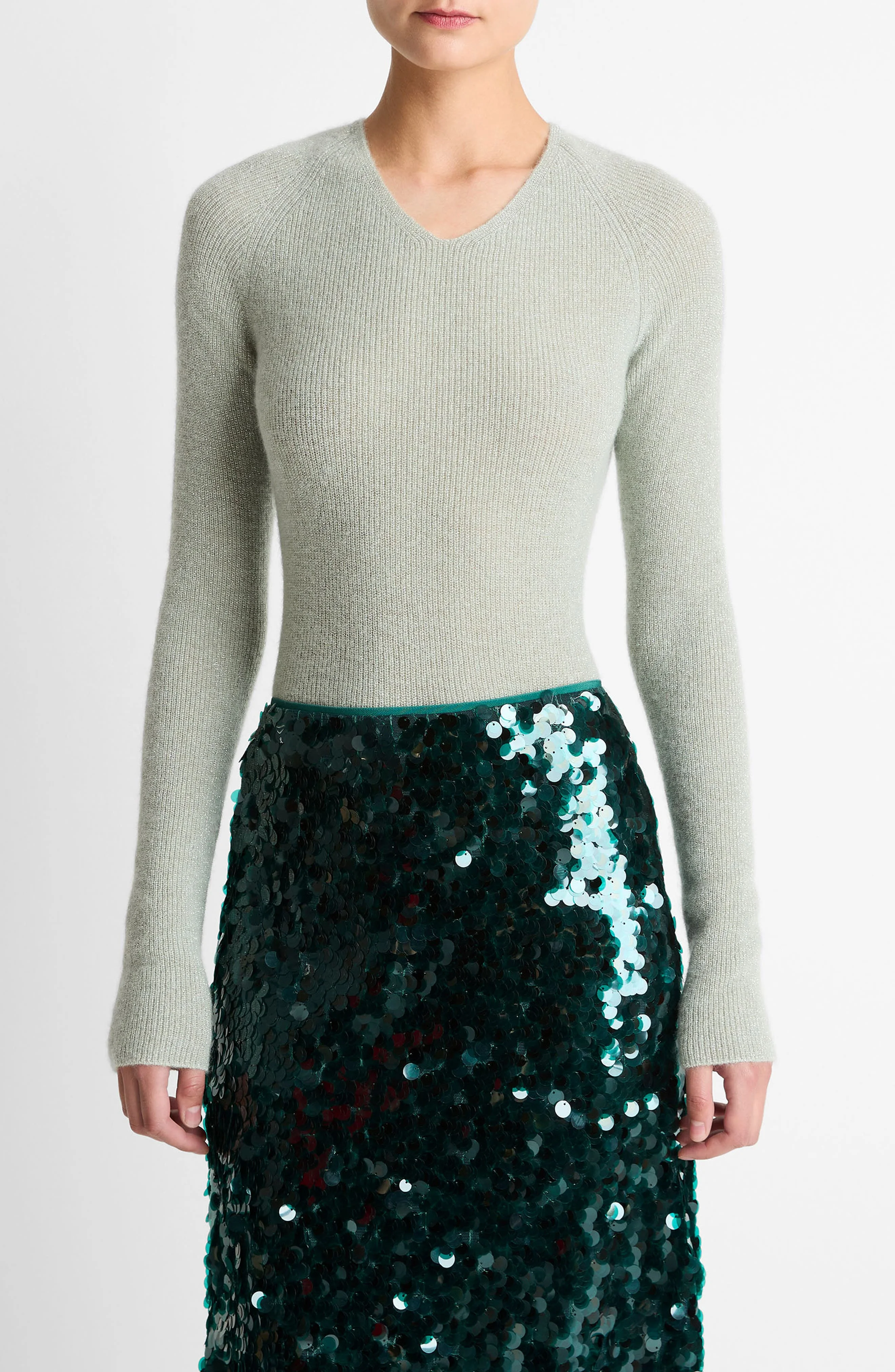 A woolly close-fitting sweater is embellished with metallic shimmer for after-hours allure. V-neck Long sleeves 44% polyamide, 21% wool, 21% alpaca hair, 14% metallic fibers Hand wash, dry flat Imported