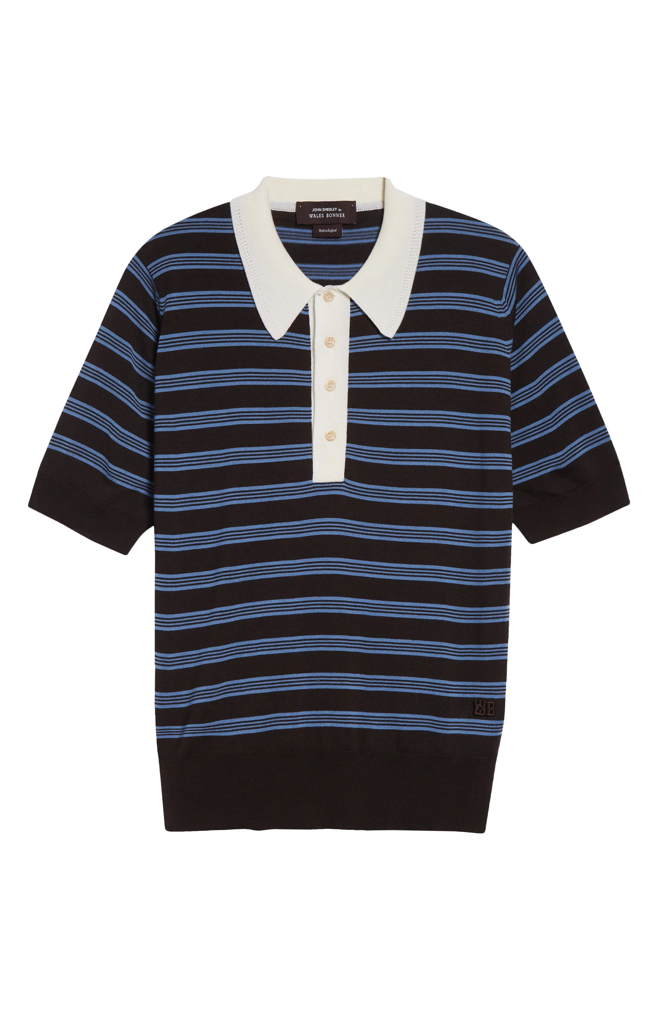 Blue stripes pop from the black ground of this merino wool polo-sweater knit in a fine gauge with pointelle stitches framing the contrast collar and signature Wales Bonner embroidery near the hem. Button half placket Point collar Short sleeves 100% merino wool Dry clean Made in the UK Designer Clothing Black Owned/Founded