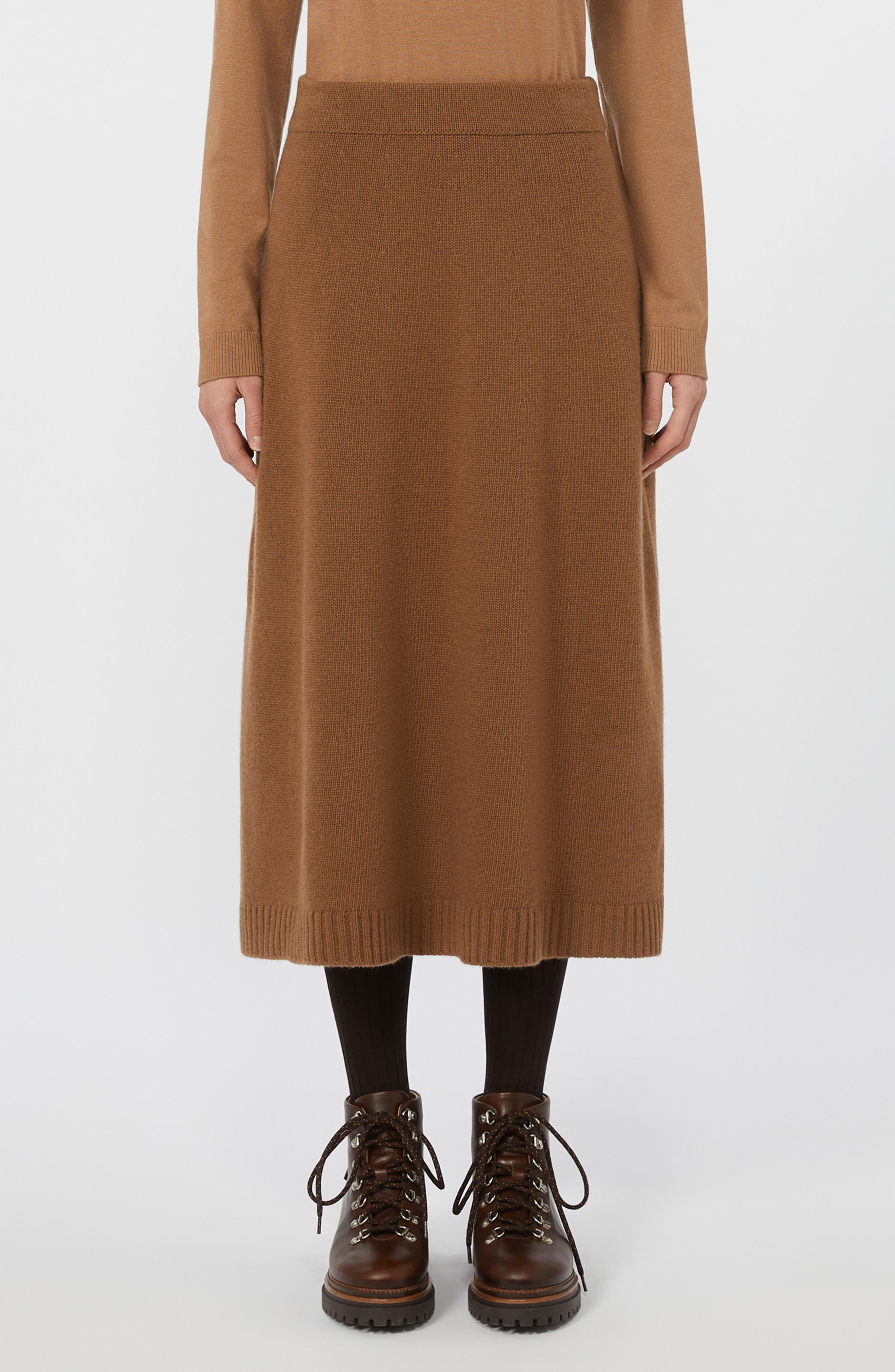 Ground yourself in the warm-hued comfort of this A-line sweater-skirt knit in a midi length from pure wool. Pull-on style Ribbed hem 100% wool Dry clean or hand wash, dry flat Imported