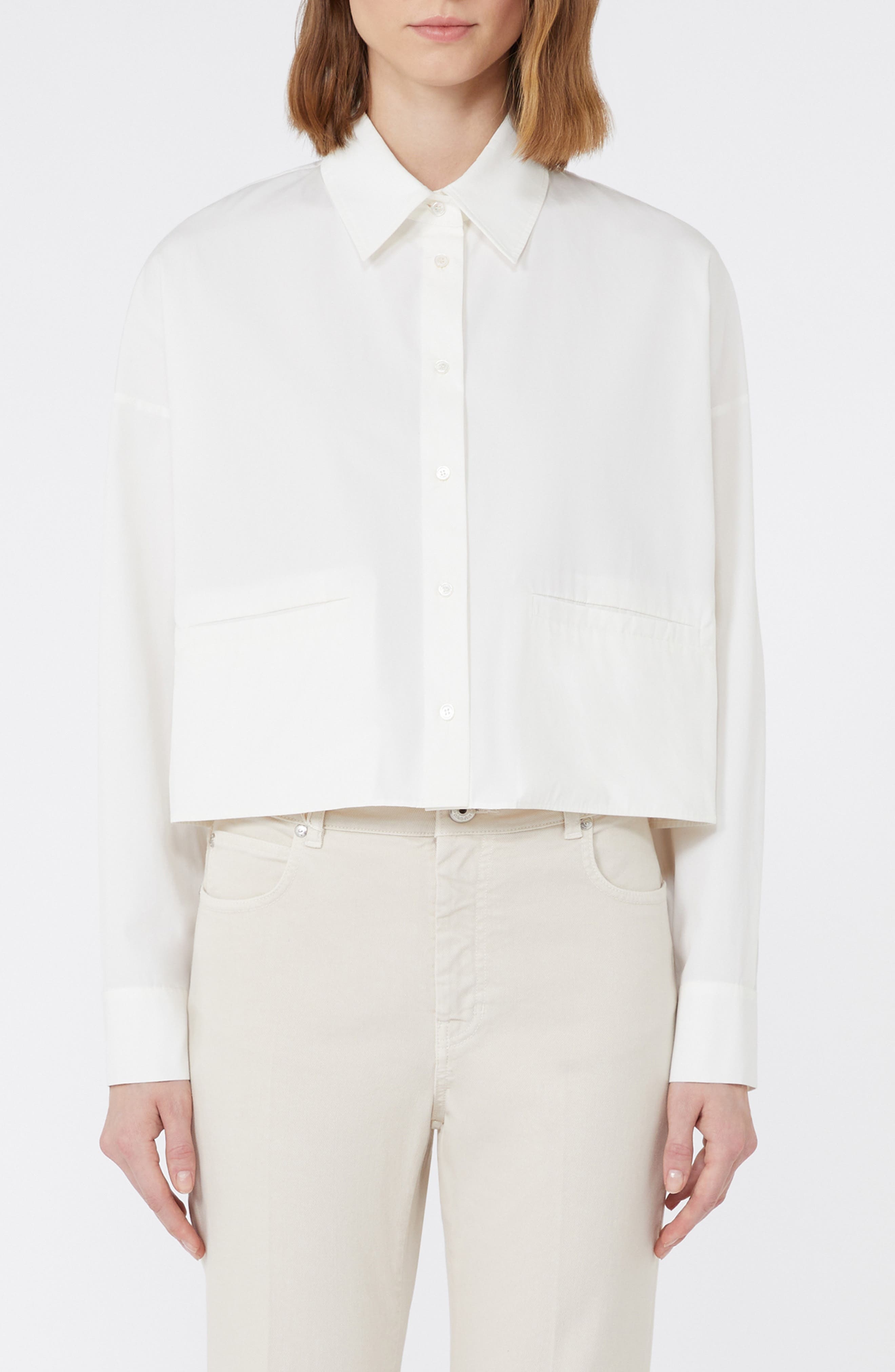A cropped boxy fit and a pointed collar updates this polished shirt cut from crisp cotton poplin and framed by dropped shoulders. Front button closure Point collar Long sleeves with button cuffs Front welt pockets 100% cotton Dry clean Imported