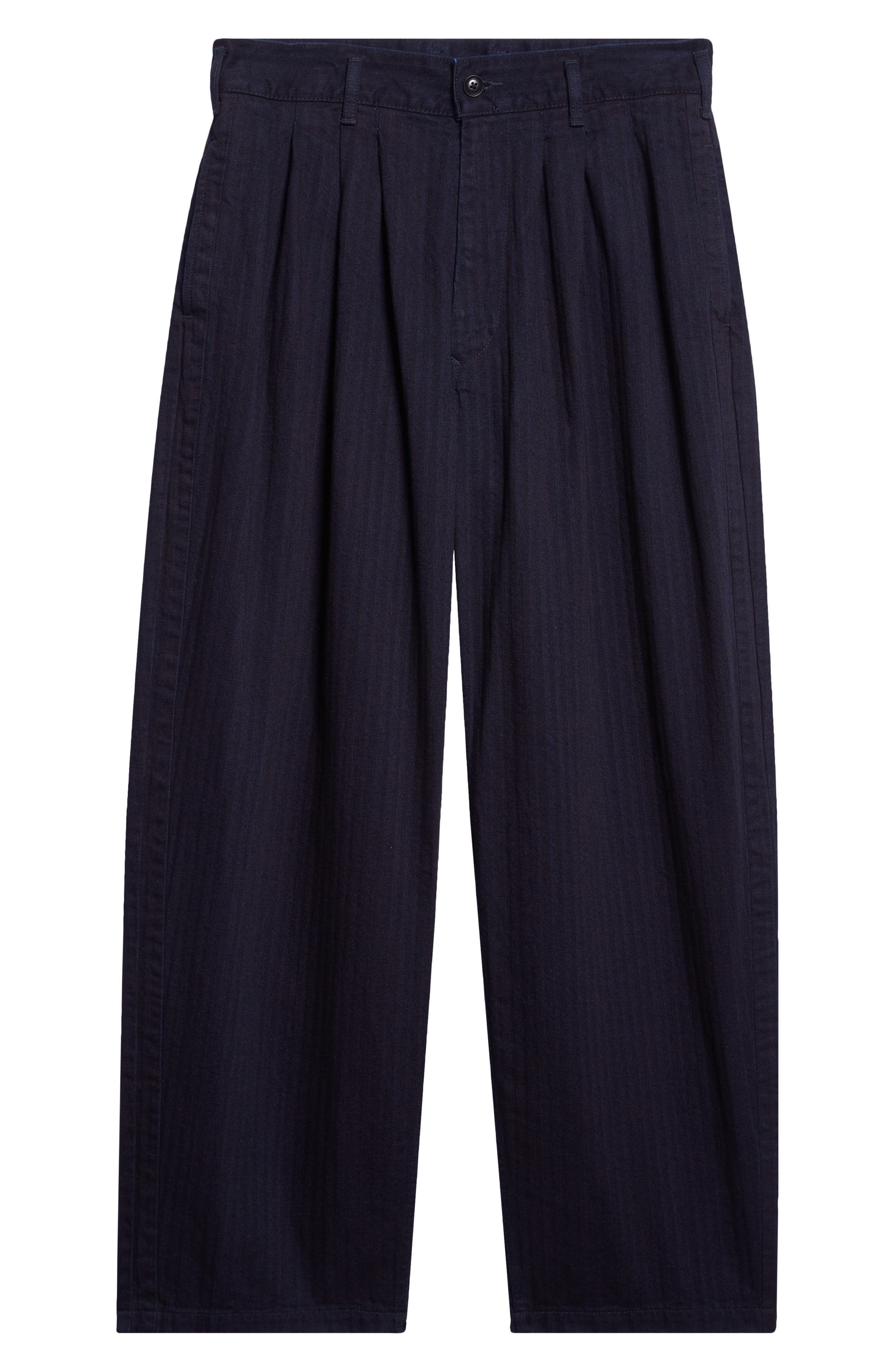 Cut from cotton herringbone denim with a fine chevron that catches the light, these pants refine utility into something quietly intentional. Precise pleats open at the waist to sculpt generous volume through the thigh then guide the leg into a clean vertical line that lands in a crisp hem. Zip fly with button closure Side-seam pockets; back patch pockets 100% cotton Machine wash, line dry Made in Japan Designer Clothing Asian & Pacific Islander Owned/Founded