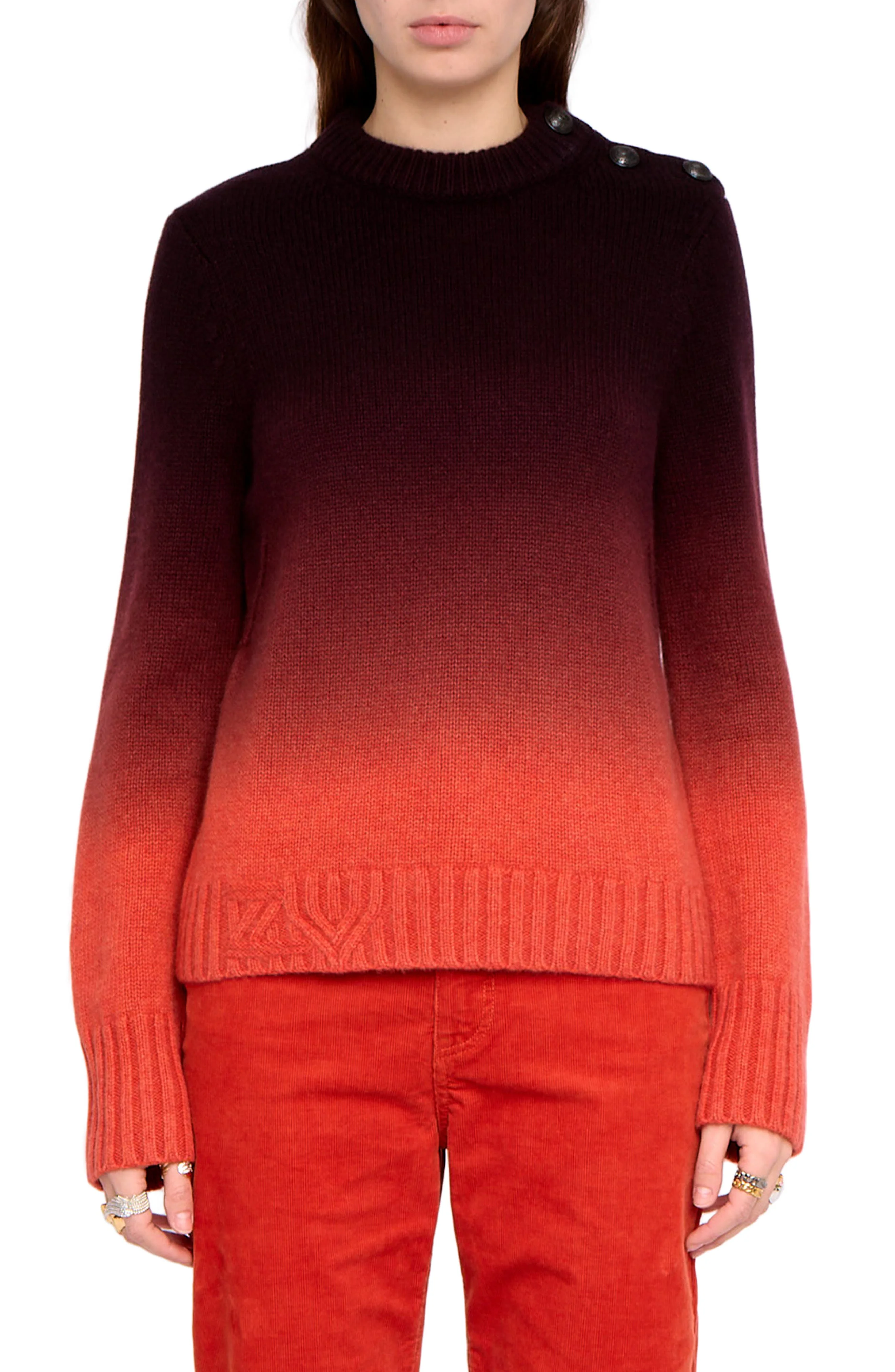 A conflagrant dip dye brings on the heat in this luxe cashmere sweater finished with crest buttons at one shoulder. Shoulder button closure Crewneck Long sleeves Ribbed cuffs and hem 100% cashmere Dry clean Imported
