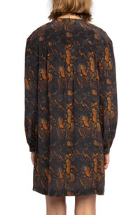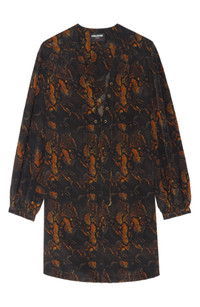 Make a retro-chic statement in this mini-length shift dress featuring a lace-up neckline and a bold snakeskin pattern. Split neck with ties Long sleeves with button cuffs Unlined 100% silk Dry clean Imported
