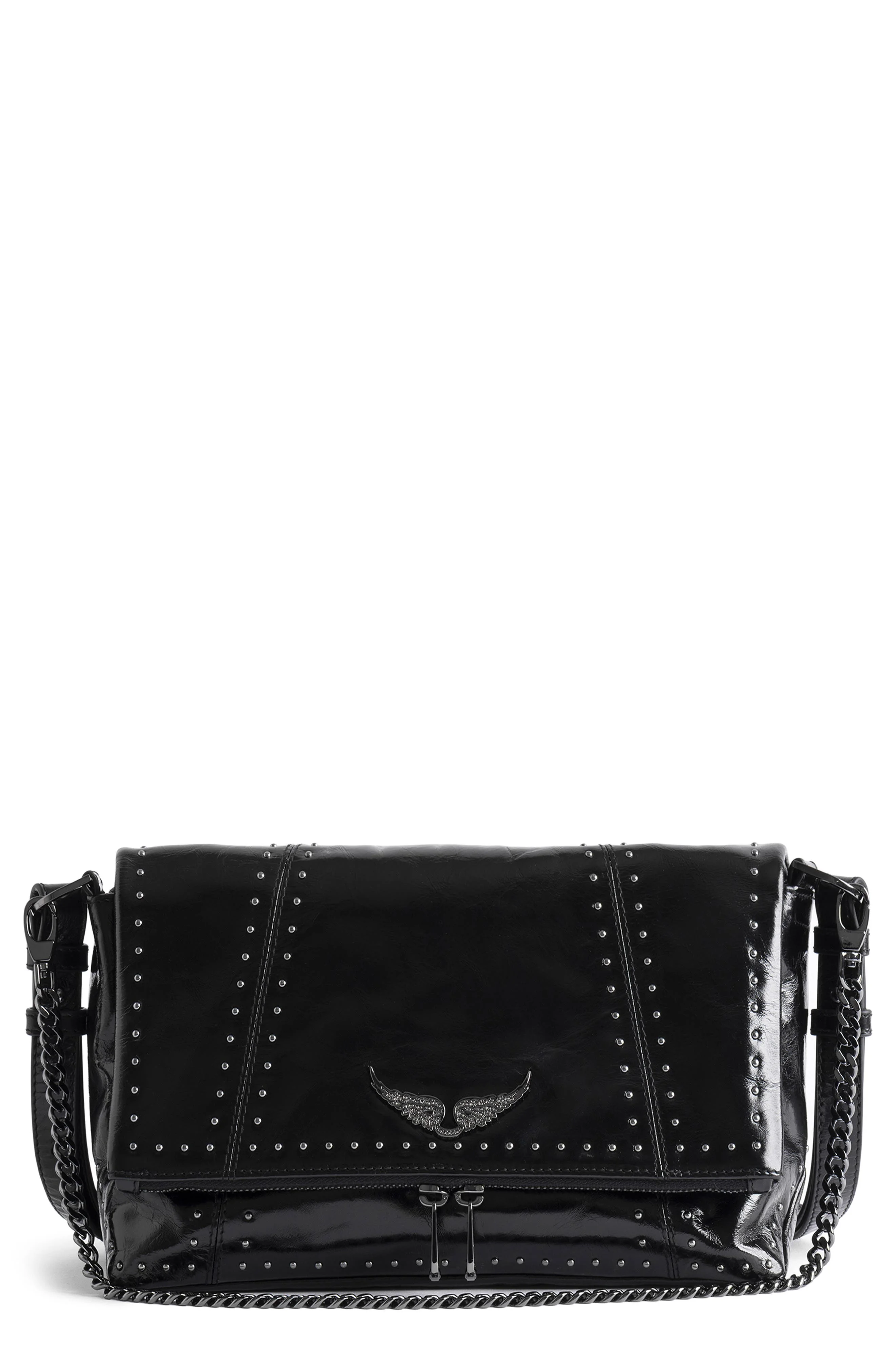 Gleaming studs and an embellished wing motif lend bold attitude to a sleek crossbody bag shaped from calfskin leather. Two-way top-zip closure Removable chain strap Interior wall pocket Structured silhouette with flat base for stability Leather Made in India